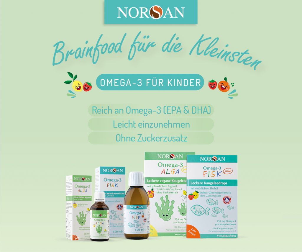 Damit Eltern ihre Kinder einfach unterstützen können, gibt es praktische Lösungen von Omega-3-Produkten für den Alltag. Omega-3-Öle, wie das NORSAN Omega-3 FISK Öl mit mildem Orangengeschmack, das eine ausgewogene Kombination aus Fischölen, reich an DHA und EPA, enthält, können leicht in verschiedene Lebensmittel wie Brei, Joghurt, Smoothies oder Müsli eingerührt werden. Eine vegane Option bietet das NORSAN Omega-3 ALGA, bestehend aus 100 % pflanzlichem Algenöl, reich an DHA und mit einem milden Zitronengeschmack. So wird die Einnahme von Omega-3 zu einem einfachen und angenehmen Teil des Alltags.