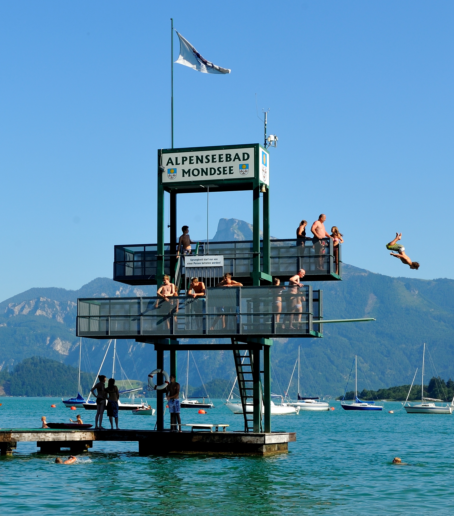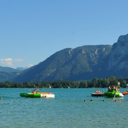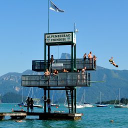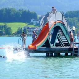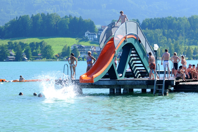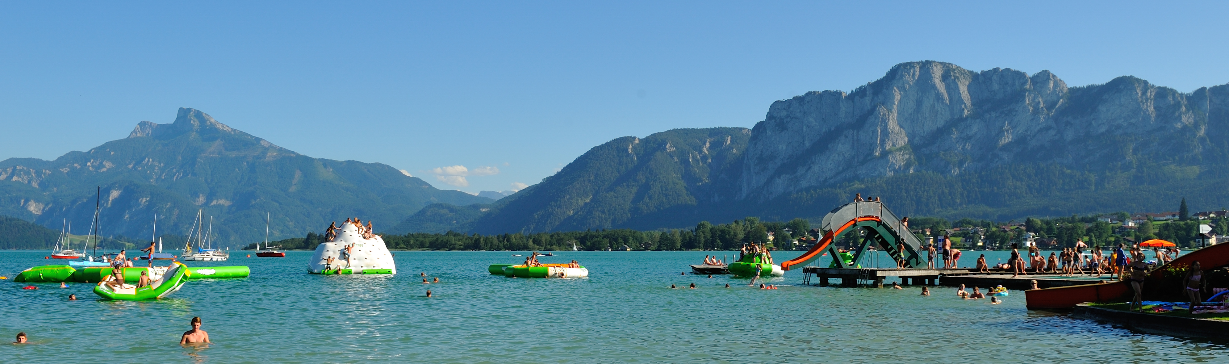 Das Alpenseebad, im Salzkammergut gelegen, bietet Spiel und Spaß im und rund ums Wasser – Panorama inklusive.