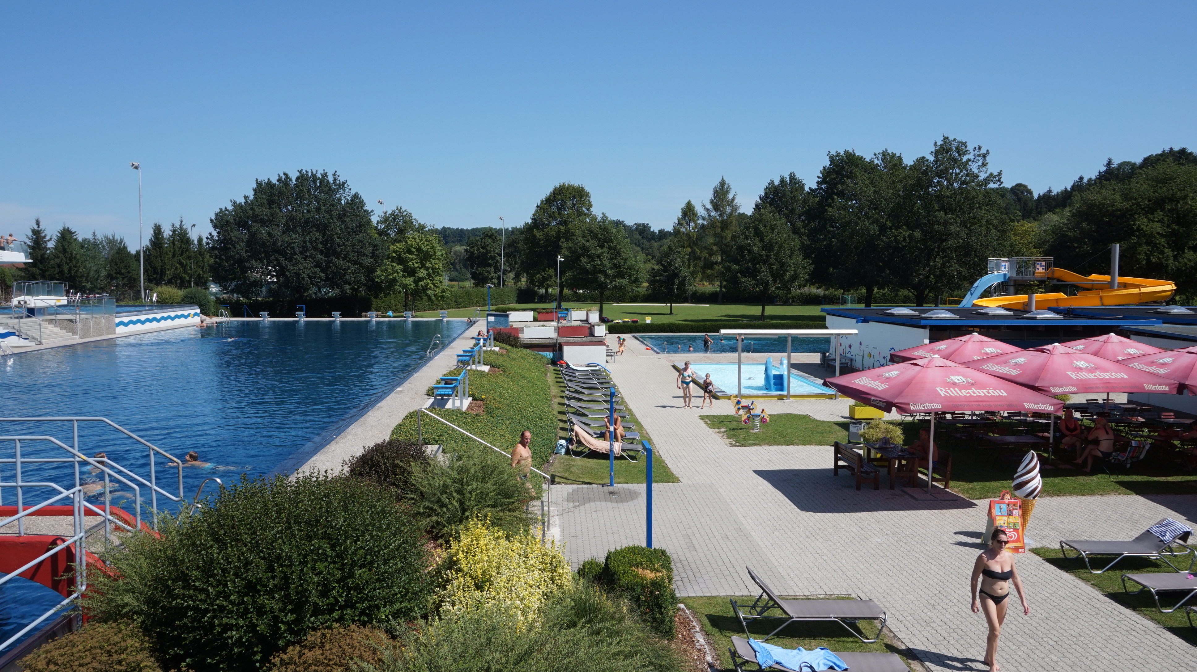 Ein Freibad für die ganze Familie: Im Erlebnisbad Riedau stehen den Gästen ein Sprungbecken, ein Sportbecken, ein Nichtschwimmerbecken und ein Planschbecken zur Verfügung.