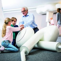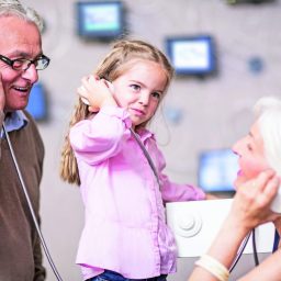 Beim Navigieren durch das Ohr in 3D, der akustischen Jagd nach unsichtbaren Vögeln und durch die Berührung überdimensionaler Sinneszellen erforschen die Besucherinnen und Besucher die vielfältigen Funktionen des Gehörs.