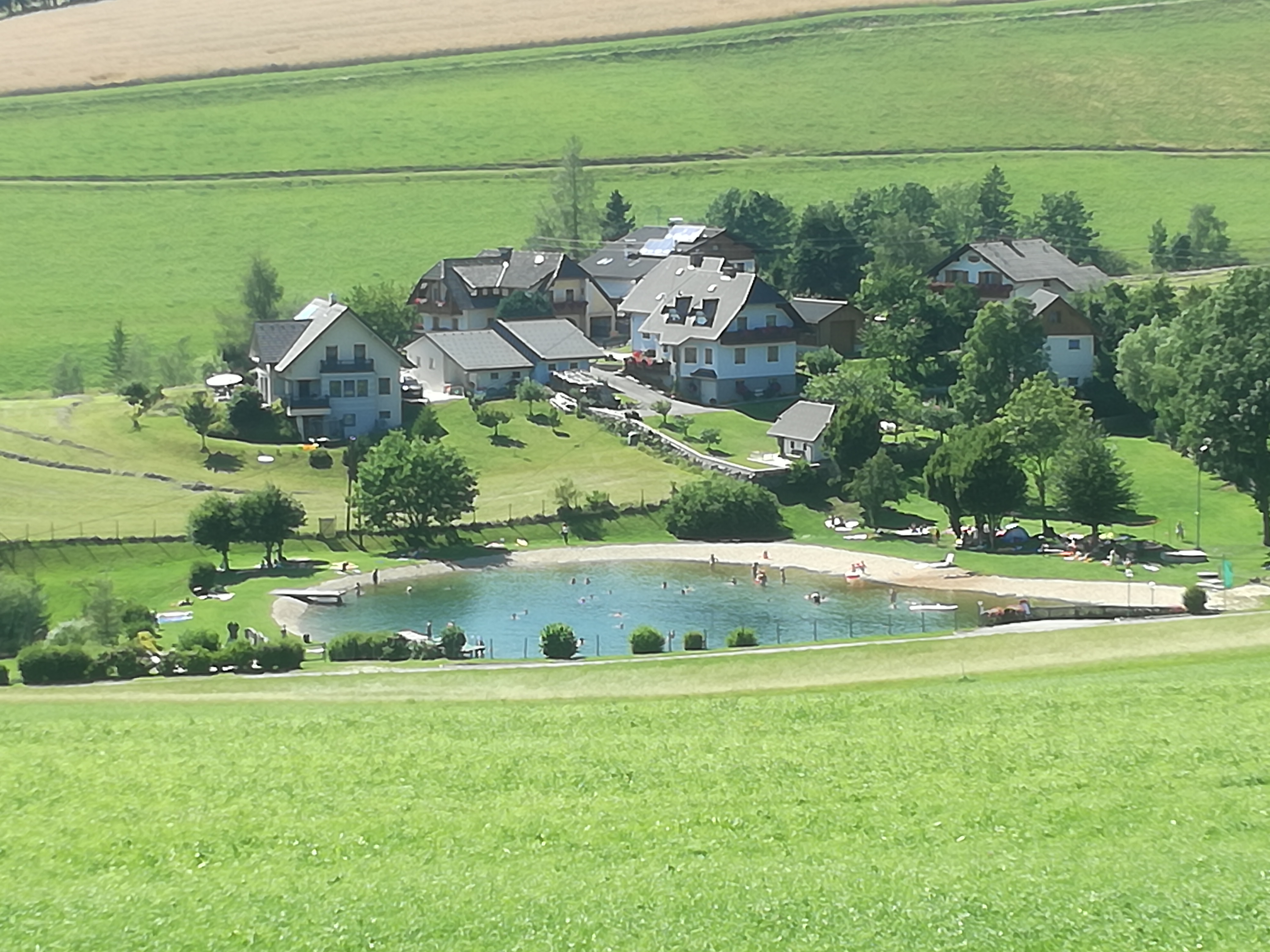Der Naturbadesee bietet an heißen Sommertagen die ideale Abkühlung und besticht vor allem durch sein klares Wasser. Durch die großzügige Liegewiese findet auch jeder seinen Platz und kann sich nach Herzenslust sonnenbaden und erholen.