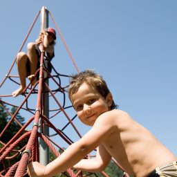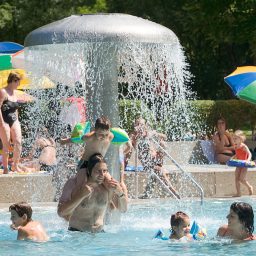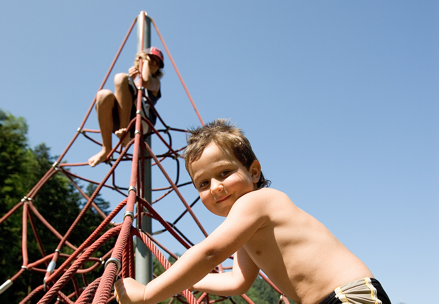 Um die Schwimmbäder herum ist der Boden gepflastert und ermöglicht einem ein sicheres laufen bei nassen Konditionen. Für Familien ist der Eltern-Kind-Bereich ein gemütlicher Platz, um mit dem Kind zu spielen. Auf dem Abenteuerspielplatz mit Kletternetz geht es hingegen spaßig und lebendiger zu.