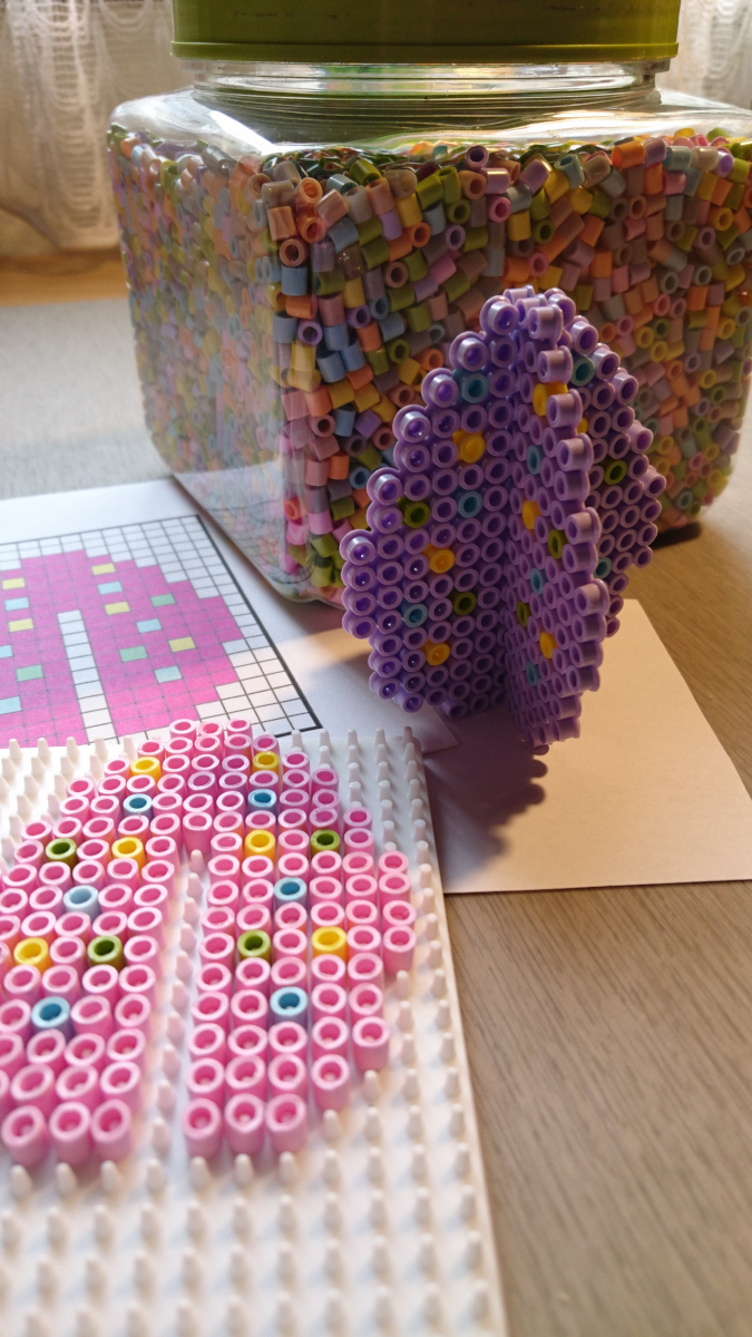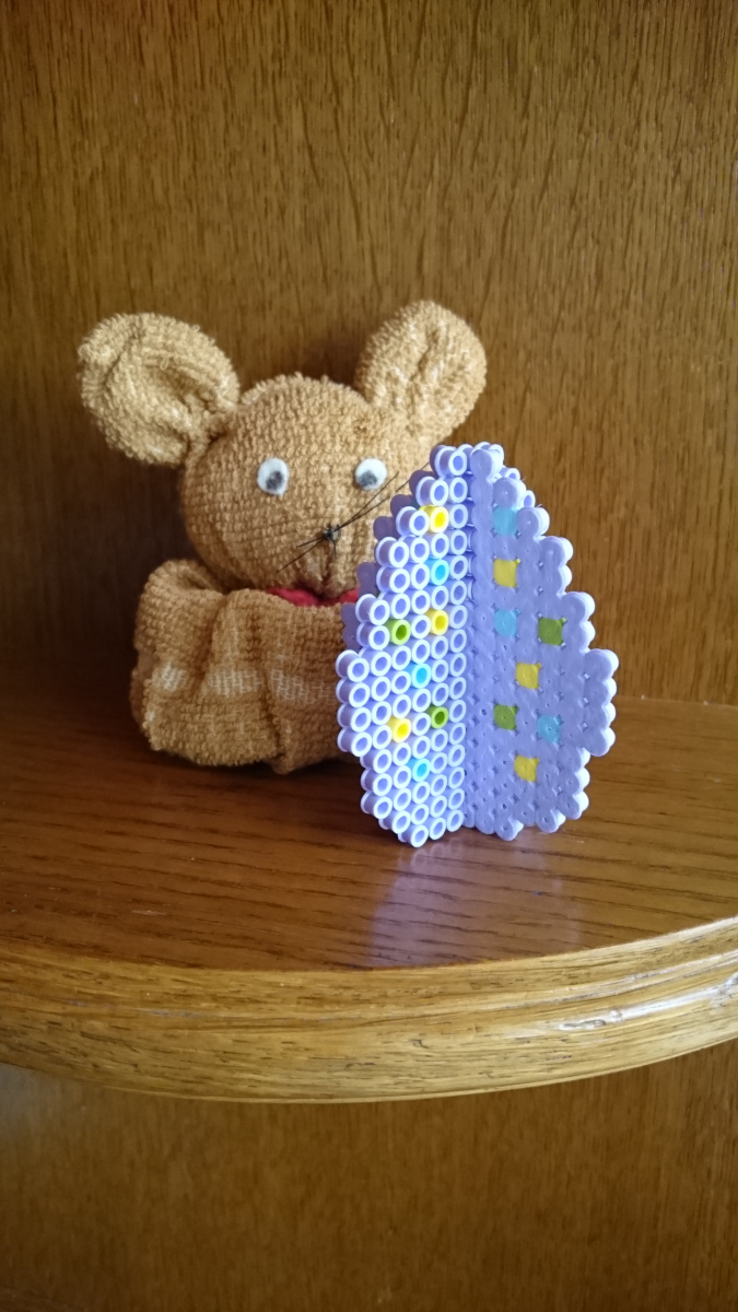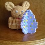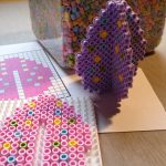 Für diese Aufsteller haben wir uns die Bügelperlen-Vorlage von HelloKids.com heruntergeladen. Dann braucht es nur mehr eine Bügelperlenplatte (wir haben eine 14 x 14 cm lange Platte genommen – da haben beide Eier nebeneinander Platz) und bunte Perlen – schon kann es losgehen. Unsere Tochter ist mit Feuereifer dabei und arbeitet bereits an ihrem dritten 3D-Ei – dieses Mal schon mit eigenem Muster.