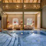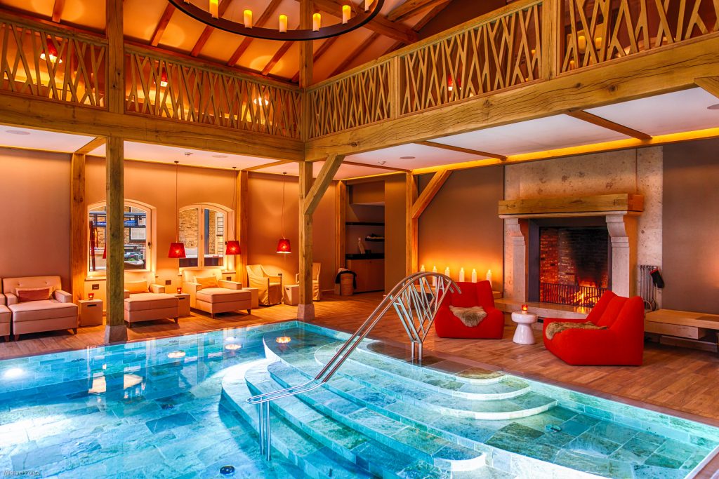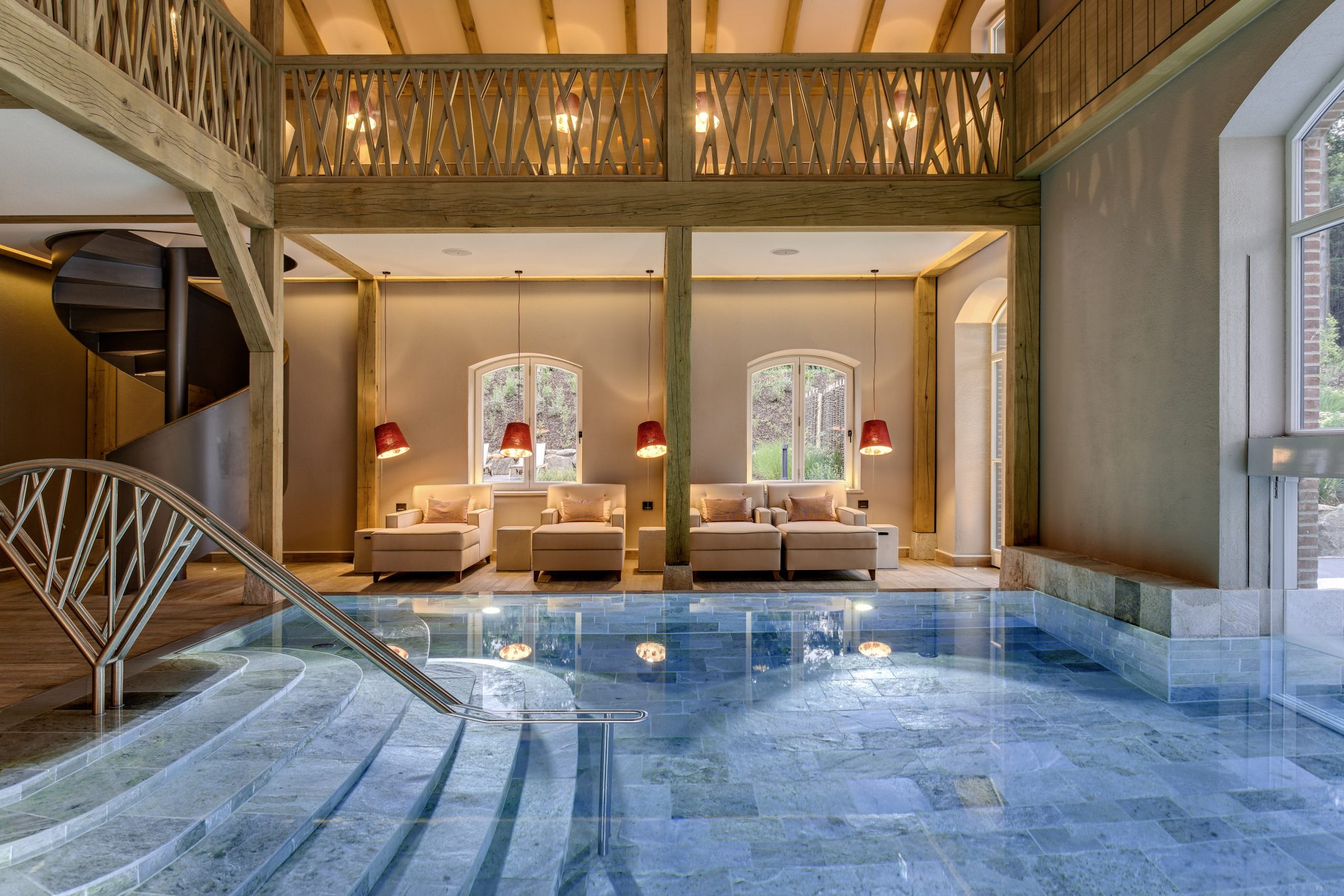 Das vielfach prämierte, 1.500 Quadratmeter große Spa befindet sich im ehemaligen Kutscherhaus, von dem noch Ziegelwände mit großen Eisenringen zeugen. Sie wurden in den Neubau integriert, genauso wie der alte Innenhof, der mit einem großzügigen Glasbau überdacht wurde. Er ist das lichtdurchflutete Zentrum des Spas, in dem sich die Vital Bar, die gesunde Snacks anbietet, befindet. Von hier aus führen nur wenige Schritte zum Fitnessbereich, ausgestattet mit modernsten Technogym-Geräten, die ganz nebenbei Bewegung in Strom umwandeln, der in das Stromnetz des Resorts einfließt. Auch zum 20 Meter langen und angenehme 35 Grad warmen Innen- und Außenpool sind es nur wenige Schritte wie auch zu den Saunen. In der Dampfsauna umhüllen ätherische Öle wie Eukalyptus und Menthol die Erholungssuchenden, die außerdem die milde Hitze eines Sanariums oder Aufgusszeremonien in der Finnischen Sauna genießen können, sowie eingeladen sind, die orientalischen Baderituale Hamam und Rasul zu erleben.