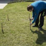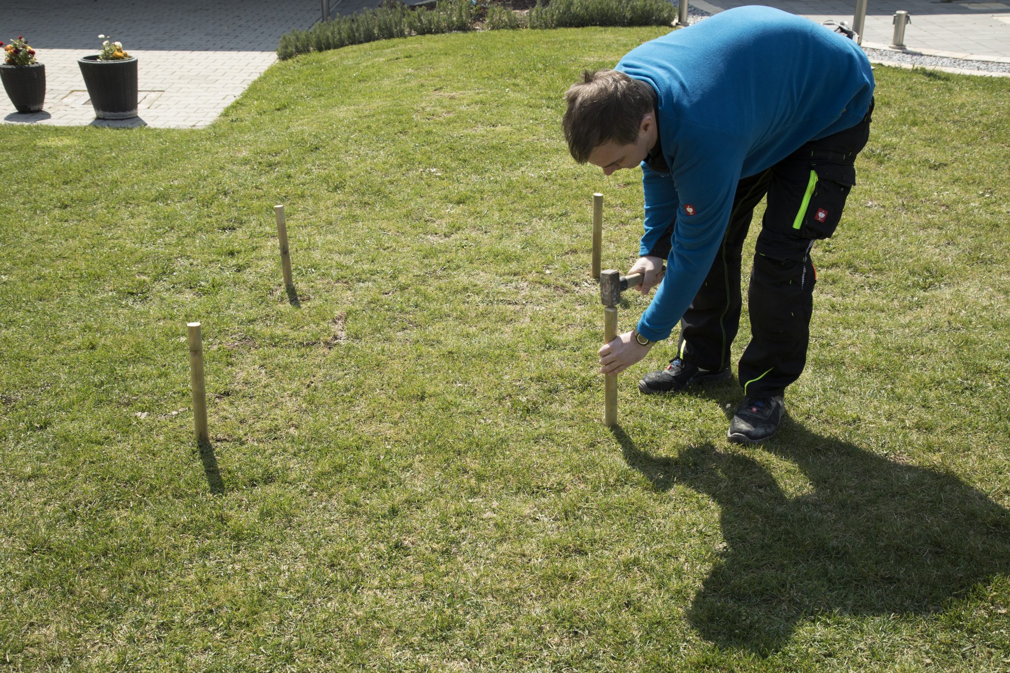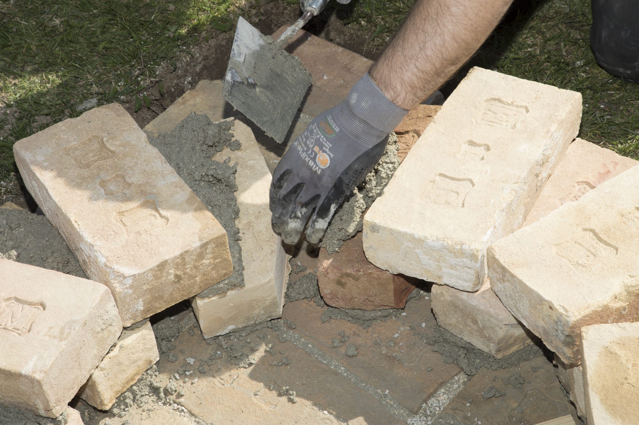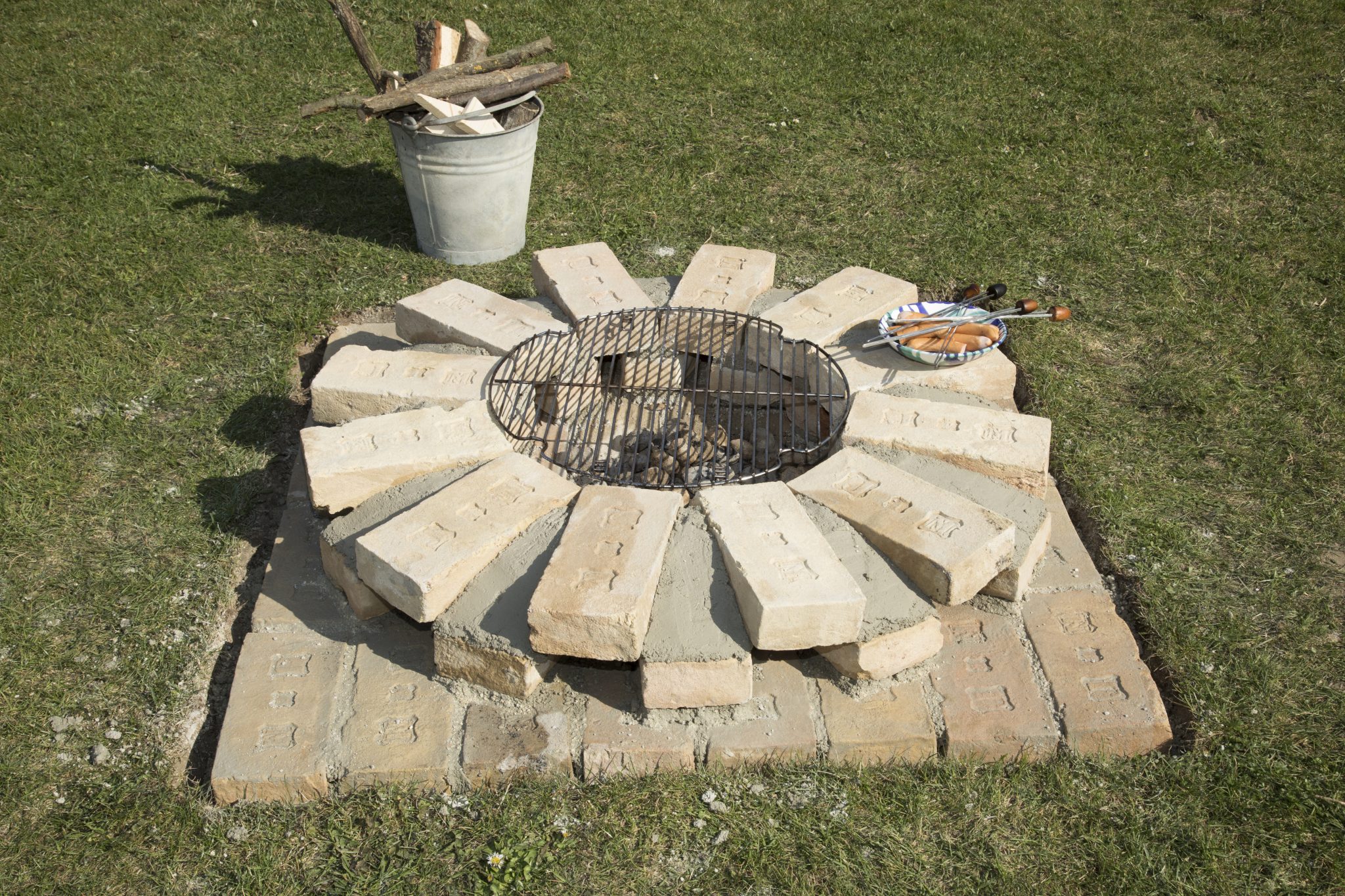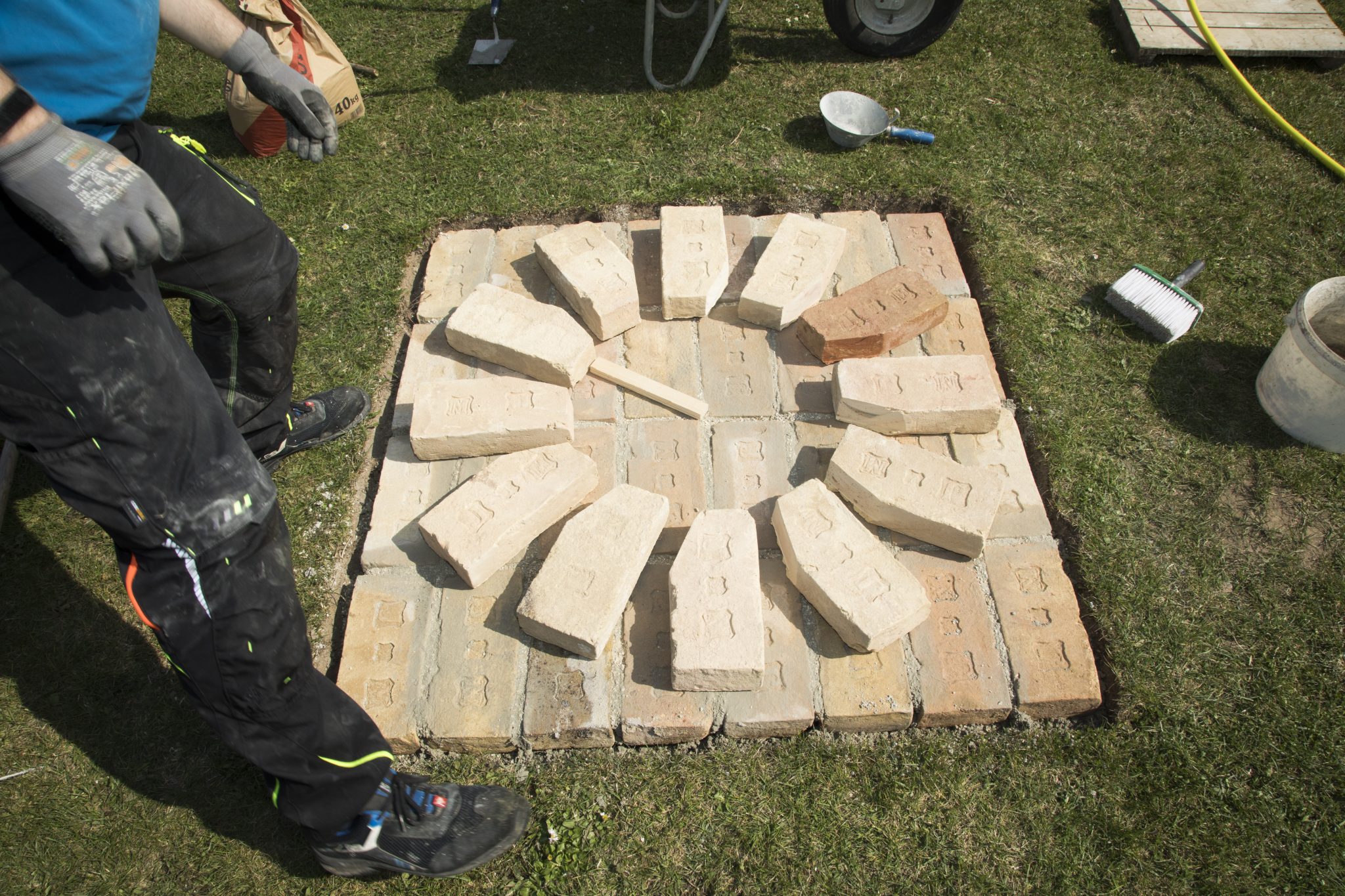 Für diese Feuerstelle mit einer Grundfläche von 125 x 125 cm sind insgesamt 56 Ziegel Mauerziegel mit den Maßen 29 x 14 x 7 cm nötig. Mit 32 Ziegeln wurde die Basis gelegt, darüber kommen zwei Ziegelkreise zu je 12 Ziegeln. Fünf Säcke Fertigbeton zu je 40 Kilo wurden verwendet. Drei davon werden für das Betonbett in der ausgehobenen Fläche gebraucht, der Rest, um die Ziegel zu fixieren und die Fugen zu füllen.