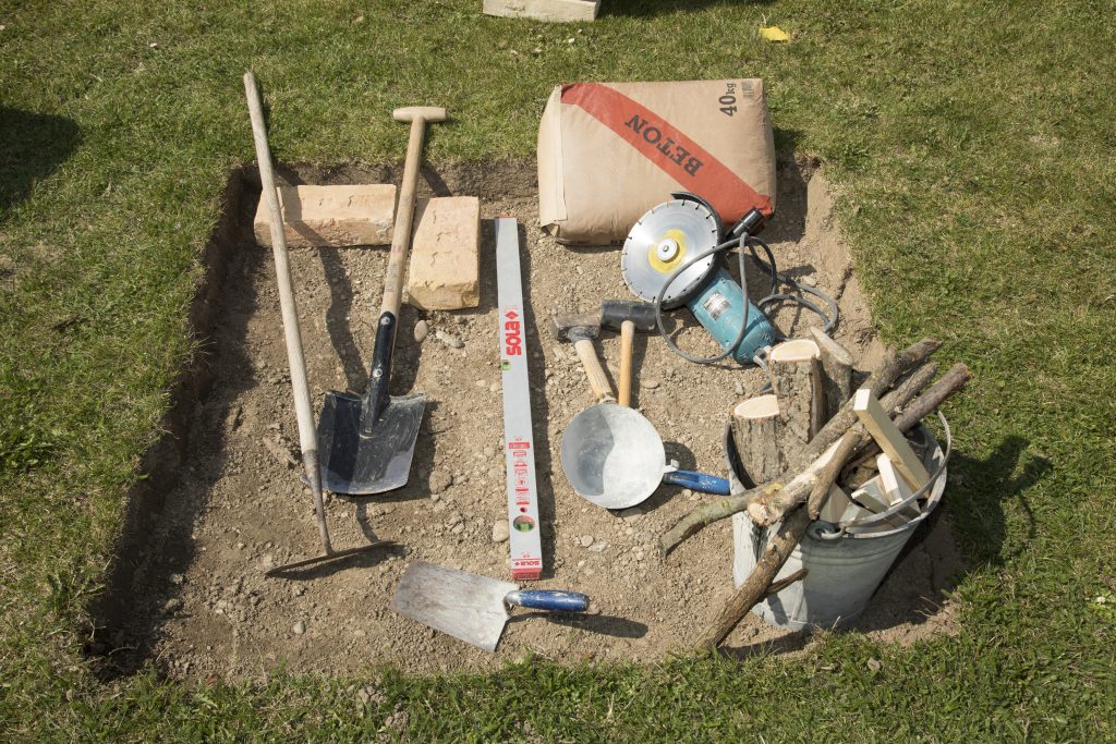 Was man noch braucht: Eine Scheibtruhe oder ein anderes ähnlich großes Gefäß, um die Betonmischungen anzurühren.
