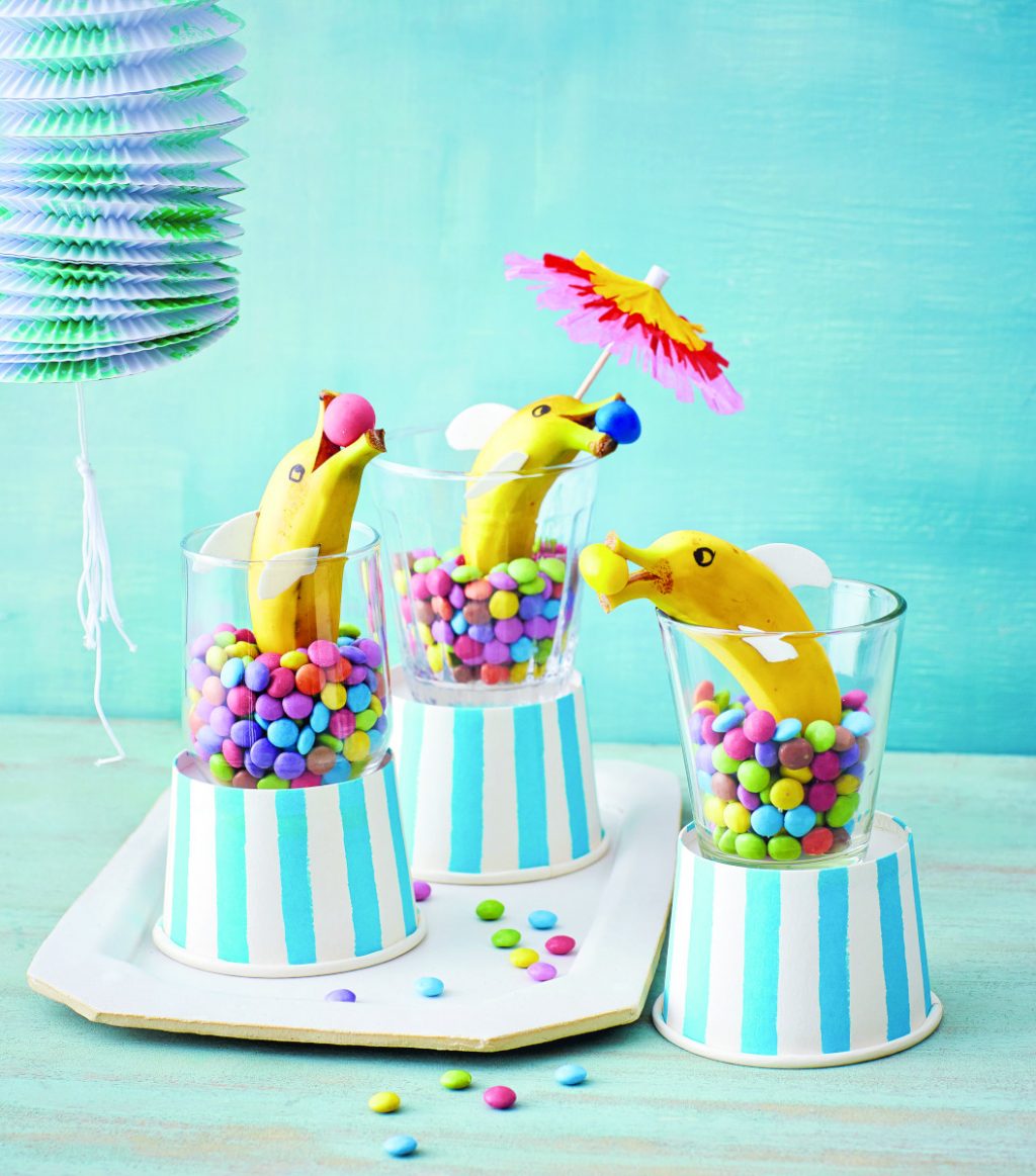 3 Gläser oder durchsichtige Becher etwa zur Hälfte mit Schokolinsen füllen und die Bananendelfine mit dem Hinterteil in das „Wasser“ stecken.
