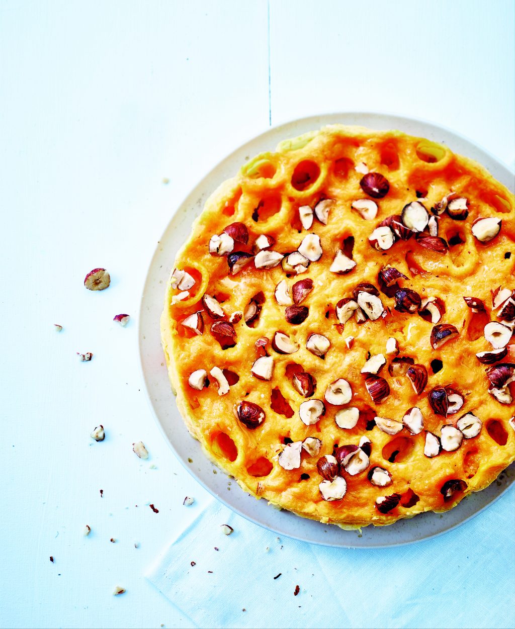Oder man verwendet Rigatoni, die an kurze Stückchen eines Gartenschlauchs erinnern. Im Gegensatz zu Penne (mit schrägen Enden) sind Rigatoni an den Enden gerade, man kann sie also aufrecht stehend in die Form schlichten wie beim Kürbis-Haselnuss-Cake. Danach werden sie mit den restlichen Zutaten übergossen. Oder – ganz gefinkelt: Man nimmt einen Dressiersack und füllt den fein pürierten Überguss in die einzelnen Röhren.