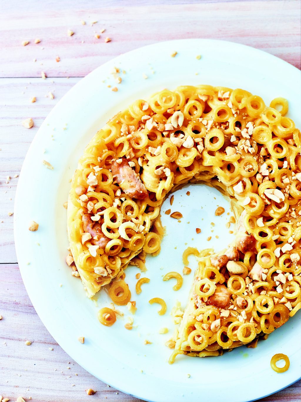 Man wähle aus der unüberschaubaren Vielfalt an Nudel-Formen, kombiniere mit Zutaten, auf die man bisher noch gar nicht gekommen ist, und schichte alles in eine Kuchen-, Auflauf- oder Tortenform. Darüber kommt ein Überguss für den besseren Zusammenhalt. Schon ab 15 Minuten Backzeit erhält der Pasta Cake seine gute Figur.