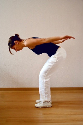 Beuge den Oberkörper nach vorne und führe deine Arme nach hinten, wobei die Füße leicht auseinander stehen und die Knie leicht gebeugt sind. Diese Übung verbessert die Koordination und Mobilisation der Brustwirbelsäule.