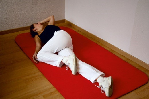 Verschränke die Arme vor dem Körper und ziehe sie leicht auseinander. Spüre den Zug zwischen den Schulterblättern. Richte den Blick neben das Knie und achte darauf, den Rücken nicht gegen die Unterlage zu drücken. Diese Übung trainiert die schrägen Bauchmuskeln.