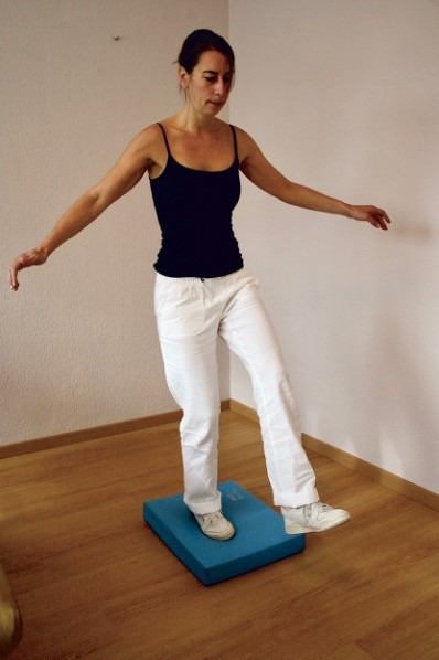 Stehe auf einem Bein auf einer flexiblen Unterlage und wechsle die Position des anderen Fußes hinter und vor der Unterlage im Zeitlupentempo. Achte darauf, dass das Knie und der Fuß der Standbeinseite gut stabilisiert sind. Diese Übung fördert das funktionelle Kraft- und Beinachsentraining für die Standbeinseite.