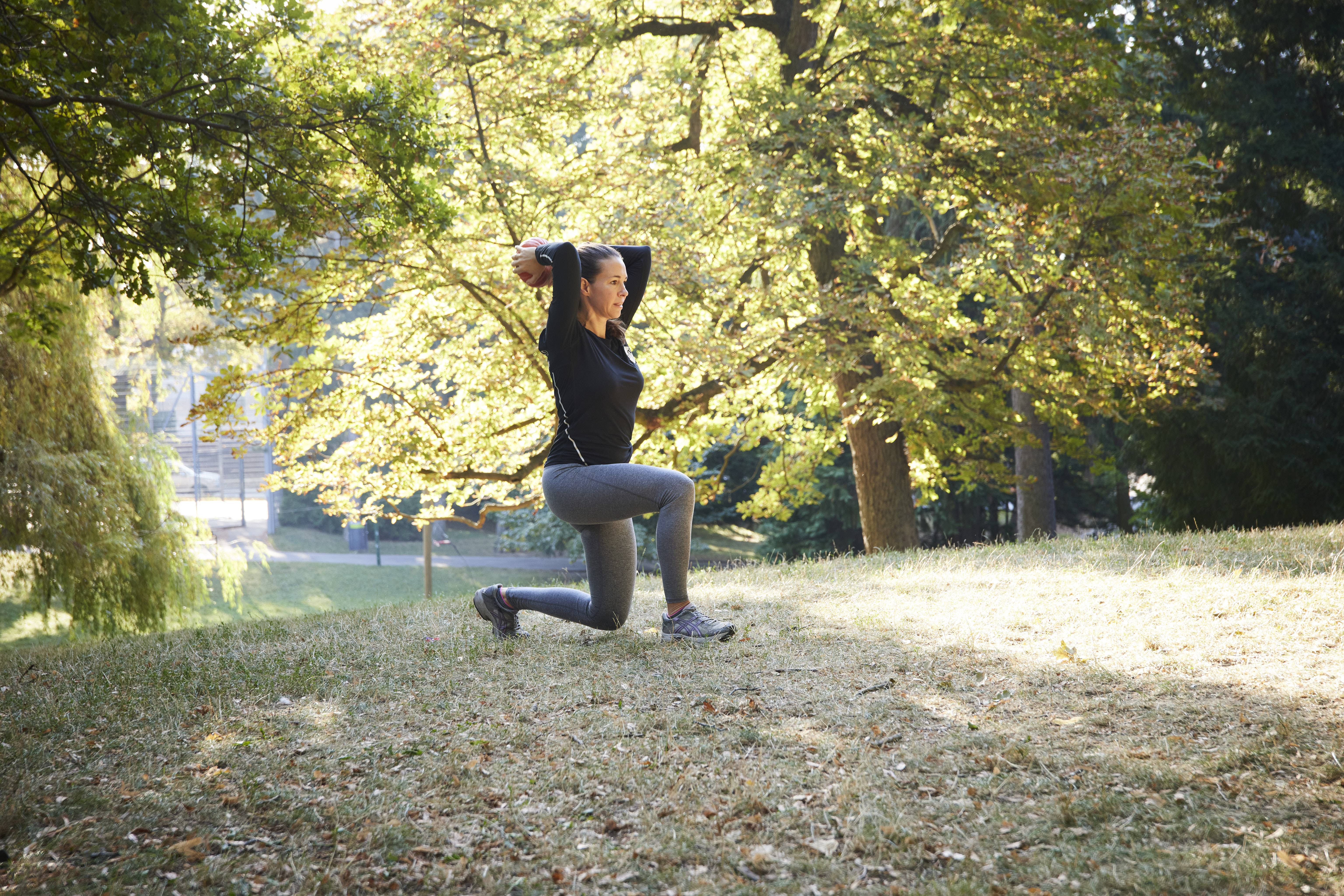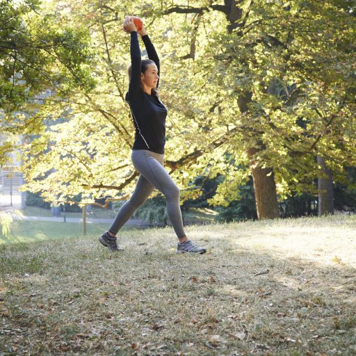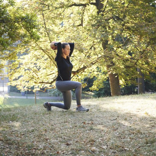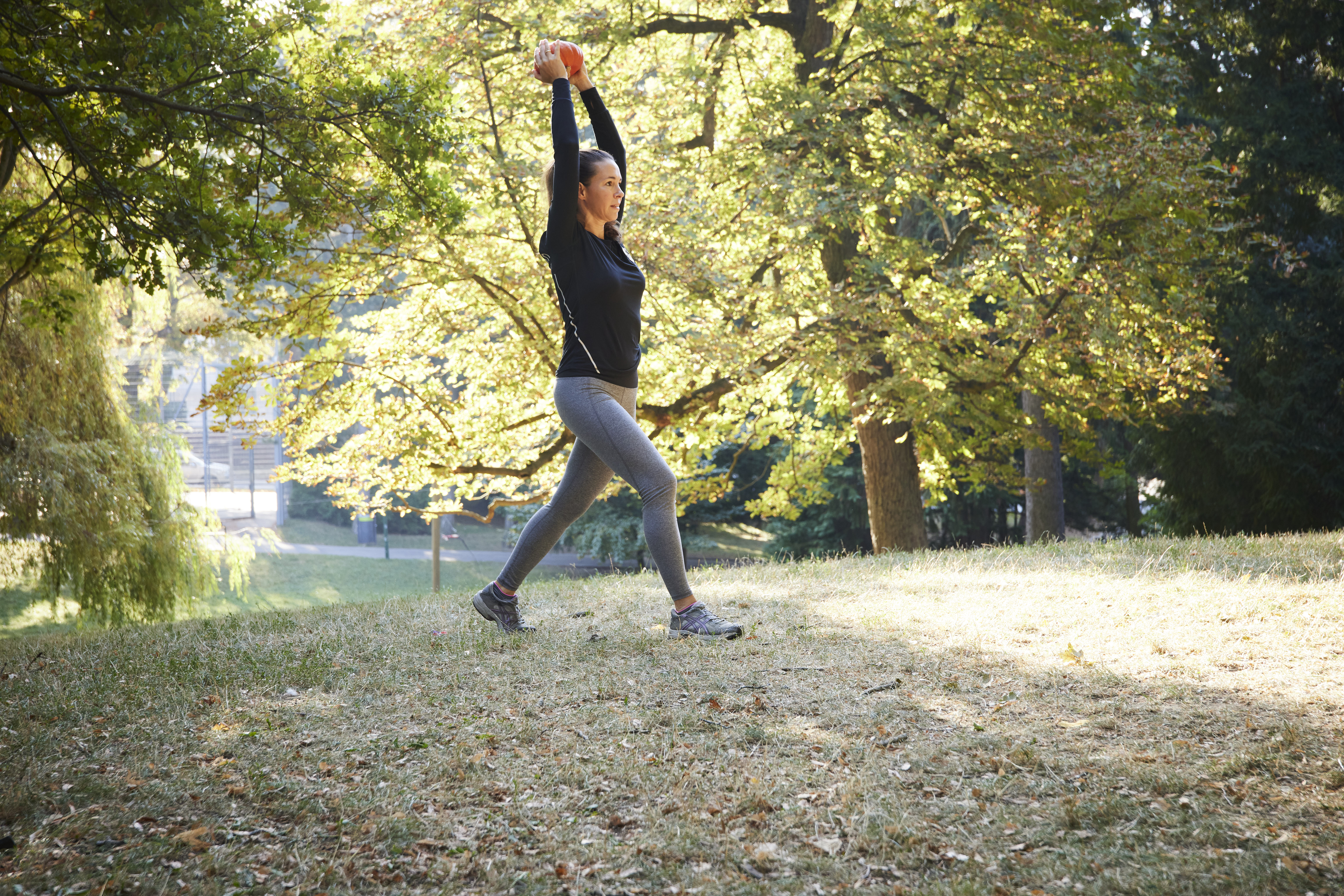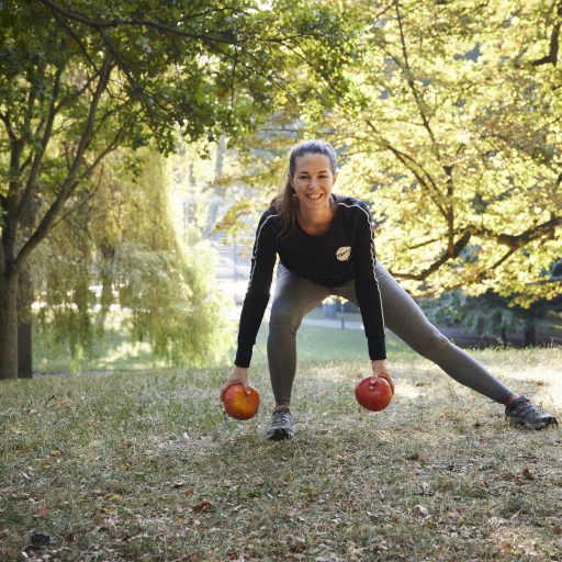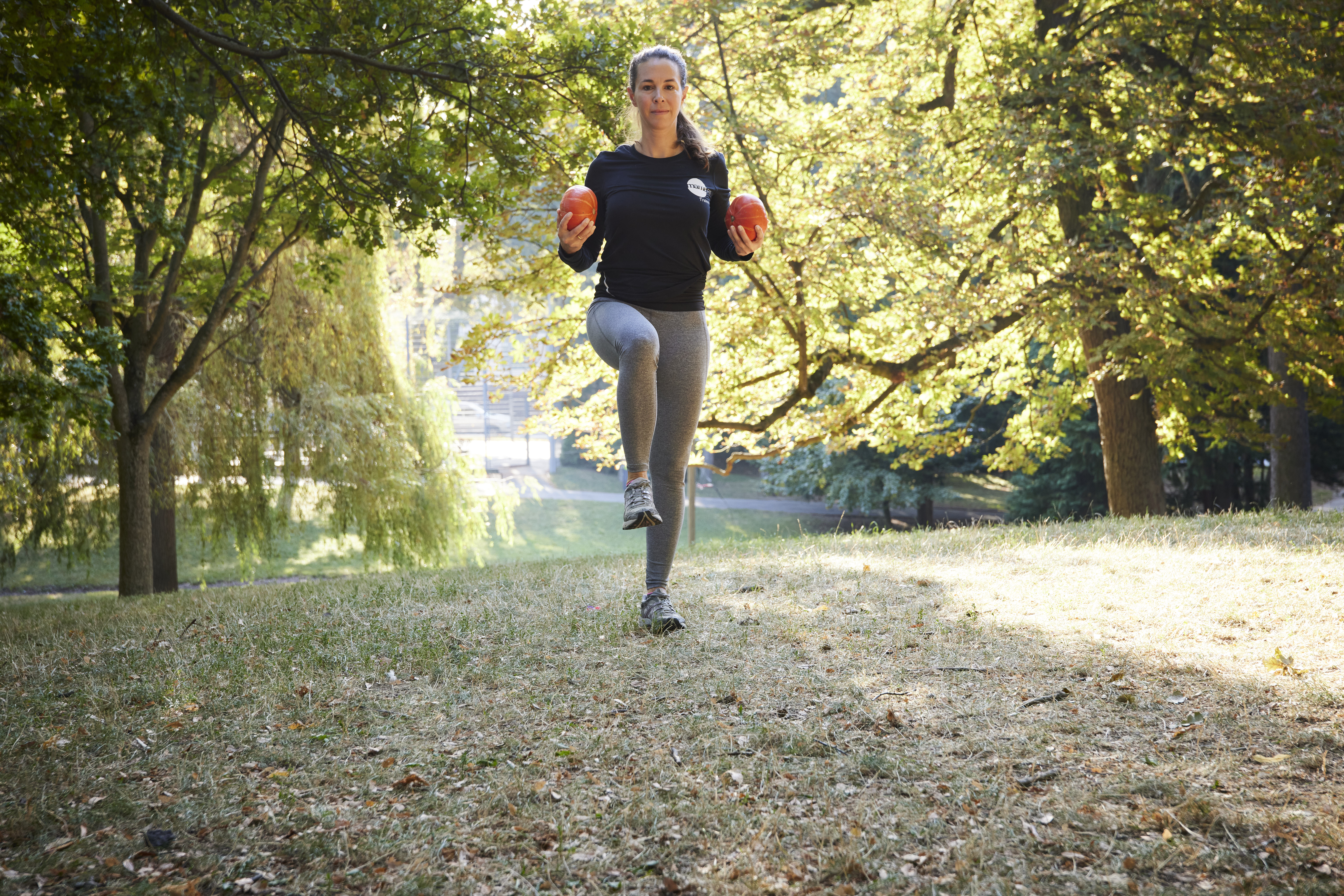 Ausführung: Hüftbreiter Stand mit den Kürbissen auf Brusthöhe, Ellbogen zeigen Richtung Boden. Körpermitte aktivieren und mit der Ausatmung Ausfallschritt zur Seite machen, bis das Kniegelenk einen rechten Winkel bildet (Achtung: nur mit fittem Beckenboden! Sonst ein bisschen schmaler steigen) Gleichzeitig die Arme mit den Kürbissen Richtung Boden ausstrecken. Der Oberkörper ist nach vorne gebeugt, der Rücken bleibt gerade. Core erneut aktivieren und in einen Einbeinstand hochdrücken. Die Arme mit den Kürbissen wieder beugen.