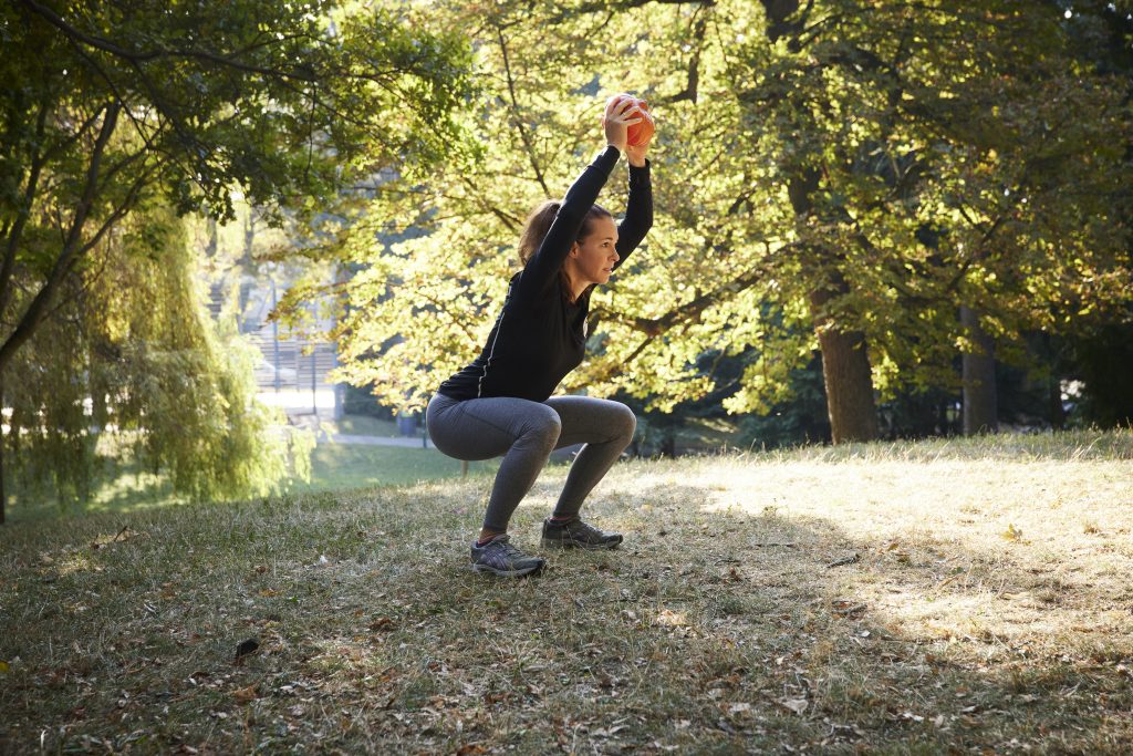 Ausführung: Hüftbreiter Stand mit dem Kürbis auf Brusthöhe vor dem Körper. Einatmen und in die Hocke gehen. Das Gesäß dabei nach hinten schieben und gleichzeitig die Arme mit dem Kürbis über den Kopf strecken. Der Rücken bleibt gerade. Mit der Ausatmung Beckenboden und Bauchnabel nach innen oben ziehen und sich wieder aufrichten.