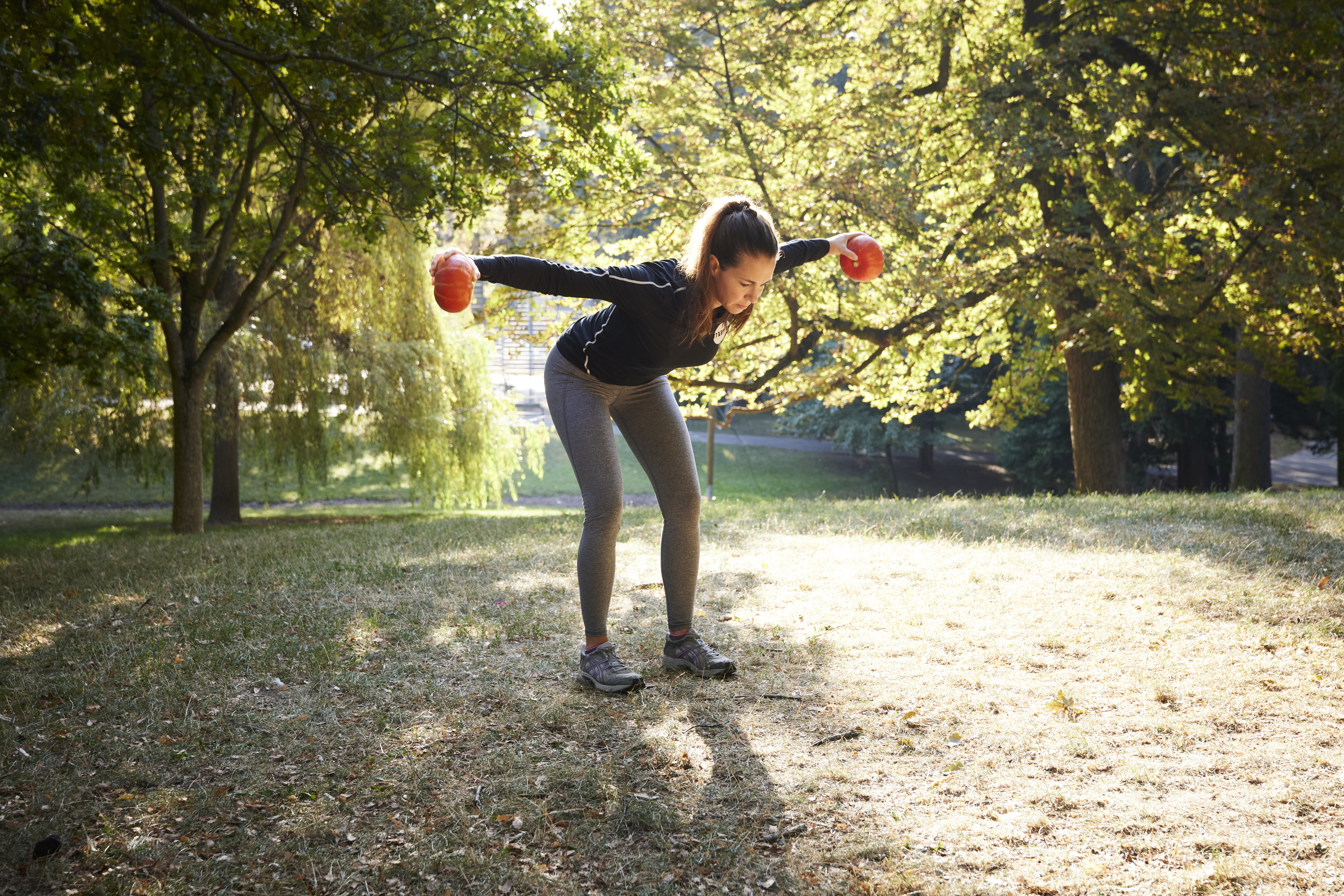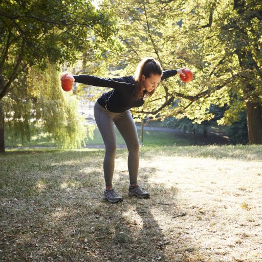 Ausführung: Hüftbreiter Stand, leicht gebeugte Knie, Oberkörper nach vorne lehnen, der Rücken bleibt gerade. Die Arme mit den Kürbissen nach unten hängen lassen. Mit der Ausatmung zuerst Beckenboden und Nabel nach innen oben ziehen, dann die Arme mit den Kürbissen bis auf Schulterhöhe anheben. Mit der Einatmung wieder absenken.