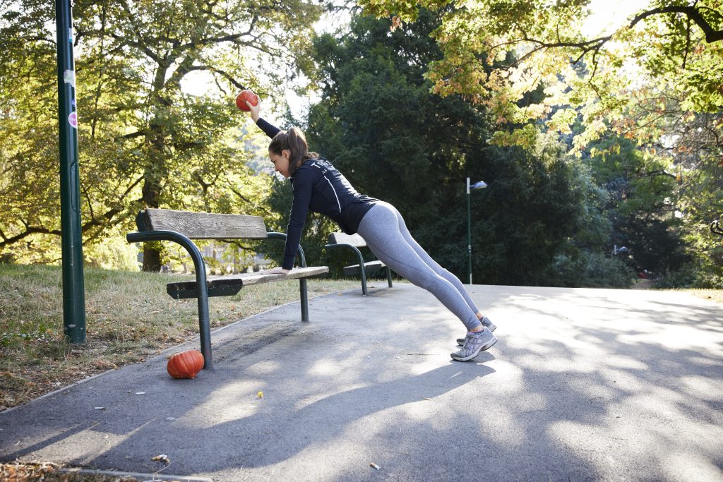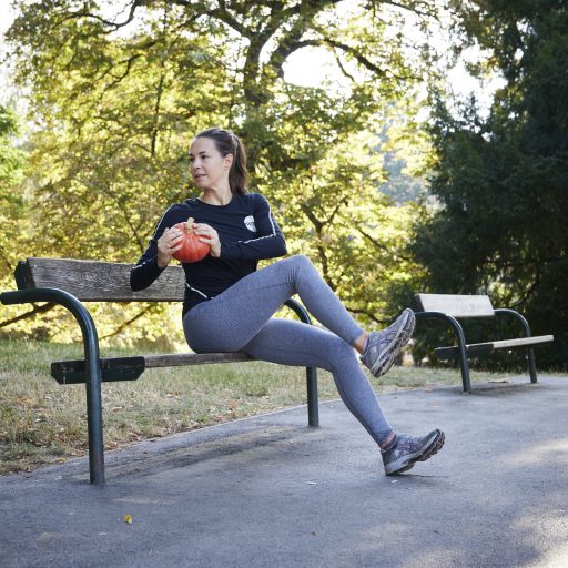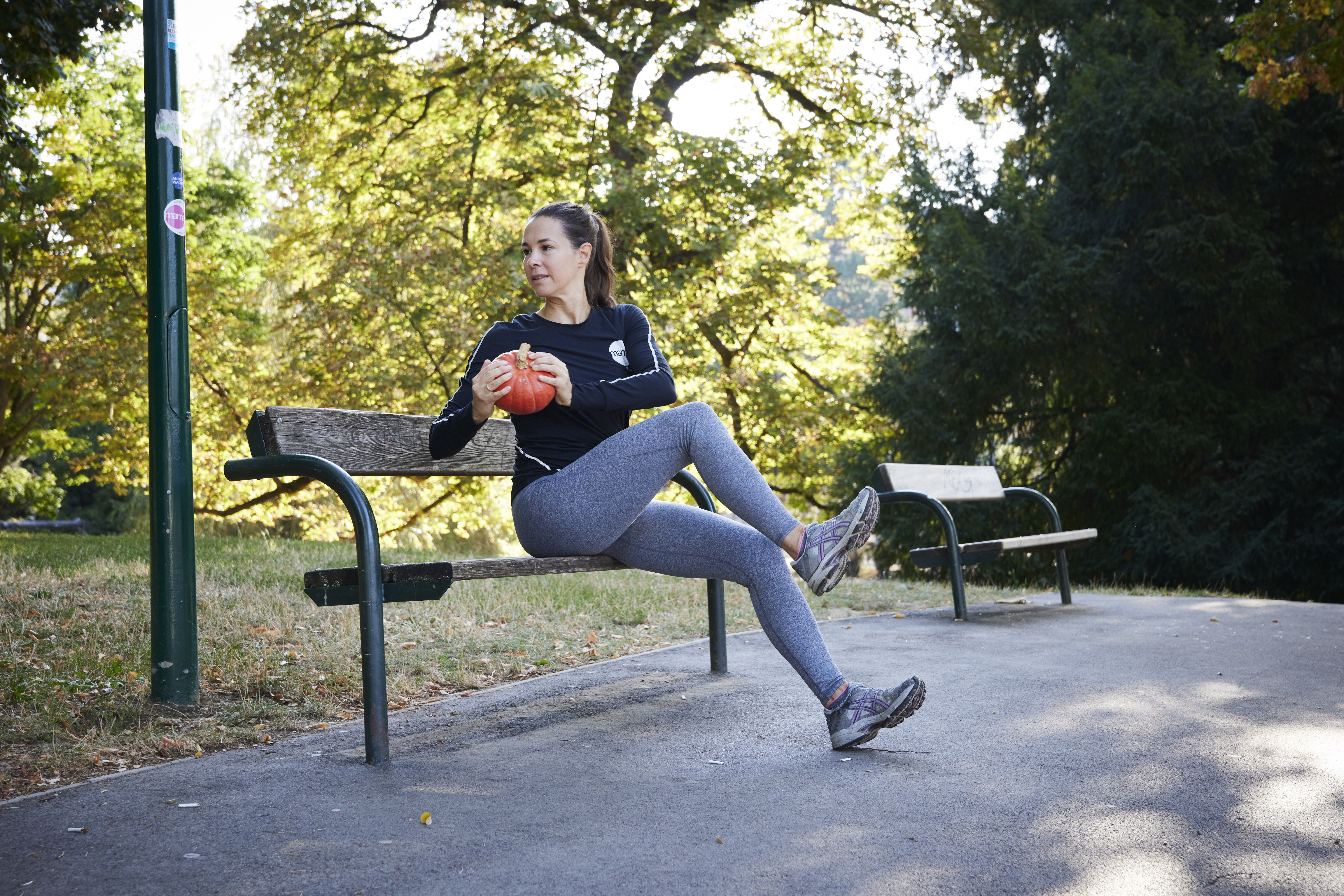 Ausführung: An die Vorderkante der Bank setzen, den Kürbis auf Brusthöhe halten. Einatmen und leicht zurück lehnen, der Rücken bleibt gerade. Mit der Ausatmung und aktivierter Körpermitte (Beckenboden und Bauchnabel ziehen nach innen oben) den Oberkörper mit dem Kürbis zur rechten Seite drehen, gleichzeitig das rechte Bein heranziehen. Seite wechseln. Die Übung wird schwieriger, wenn beide Beine vom Boden abgehoben werden.
