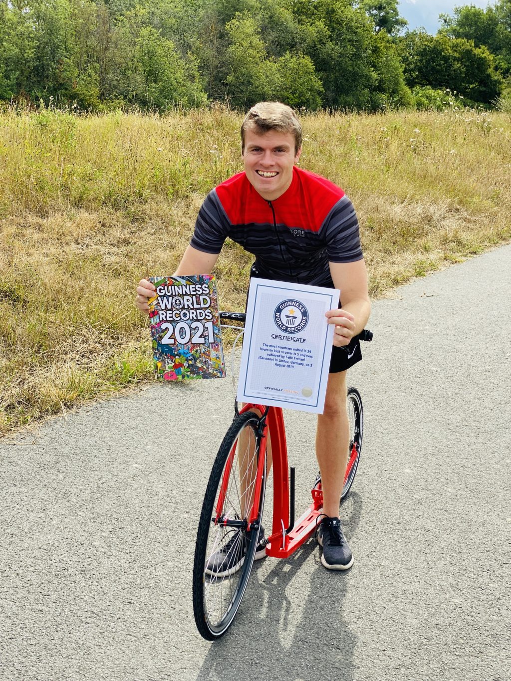 „Immer auf der Suche nach neuen Herausforderungen.“ So beschreibt sich der 33-jährige Felix Frenzel aus Ludwigshafen. Nach dieser Devise bringt er regelmäßig sein Leben in Bewegung und versucht sich an neuen sportlichen Höchstleistungen. Ob im Wasser, in sengender Hitze oder luftigen Höhen – Hauptsache unterwegs. Fünf Länder in weniger als 24 Stunden bereisen? Für viele klingt das undenkbar, jedoch nicht für Felix. Auf seinem Tretroller stellte er so einen ziemlich ungewöhnlichen Weltrekord auf („the most countries visited in 24 hours by kick scooter“): von Italien in die Schweiz, über Liechtenstein und Österreich bis nach Lindau am Bodensee. Ganze 170 Kilometer legte der Abenteurer dabei in bemerkenswerten 14 Stunden und 11 Minuten zurück. Er ist sich sicher: Mit Geduld, guter Planung und viel Willenskraft kann man alles erreichen, was man sich in den Kopf setzt.