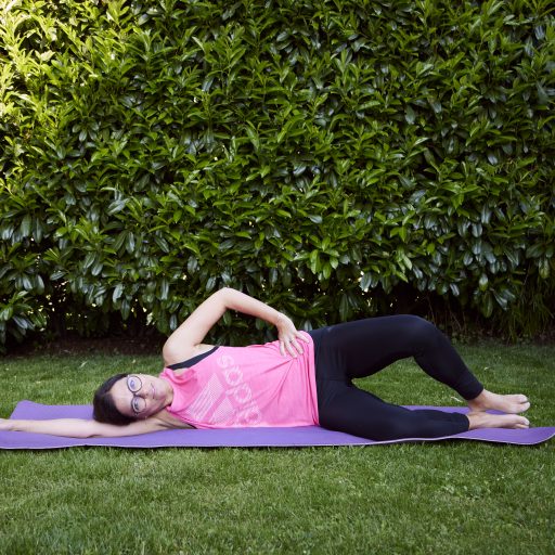 In der Seitenlage bilden dein Kopf, Schultern und dein Becken eine Linie und deine Beine sind gebeugt. Fauste die oben liegenden Hand und stelle sie zwischen Nabel und Brust auf die Unterlage ab.