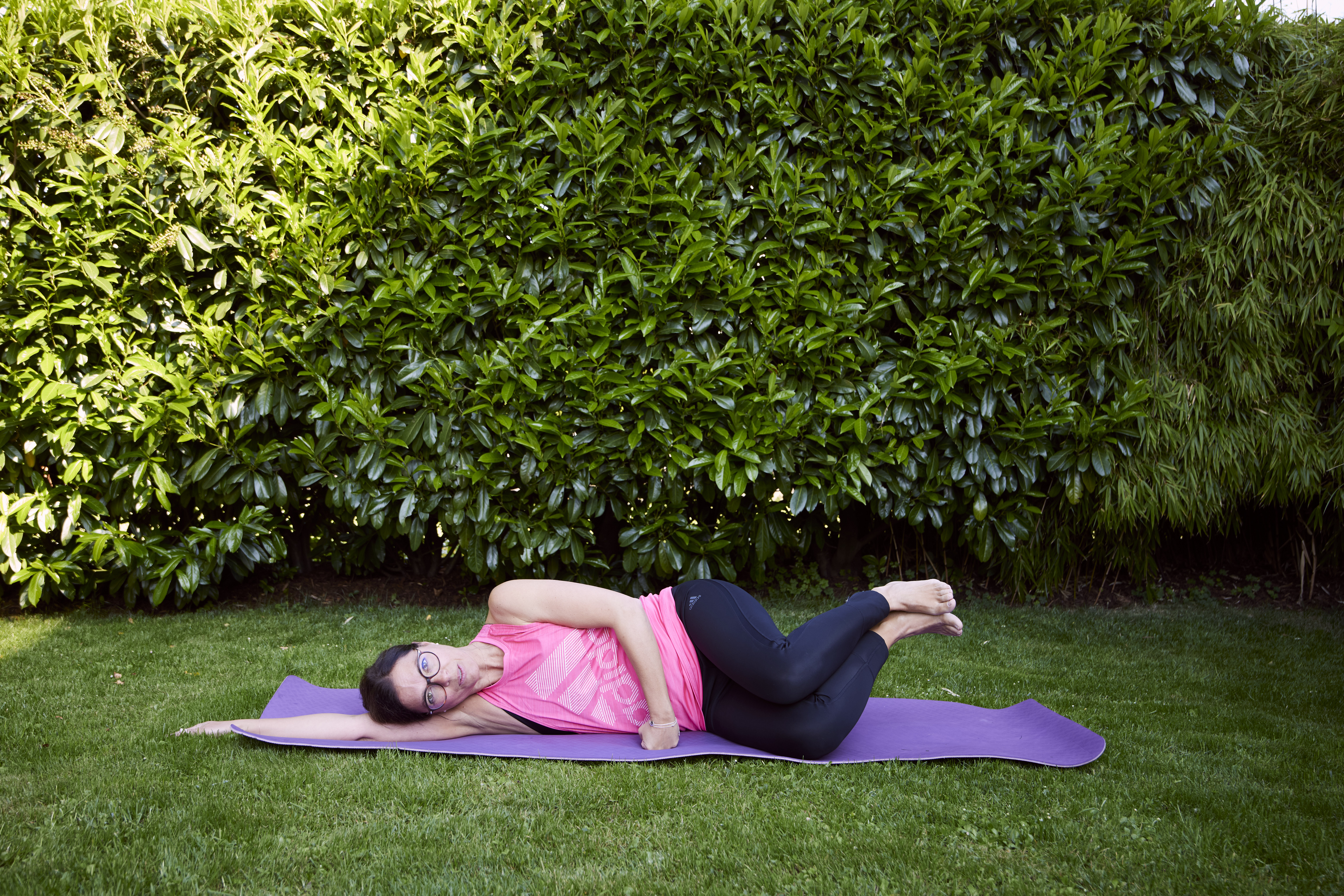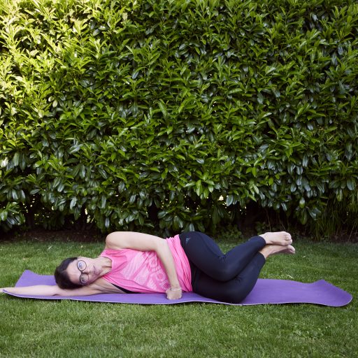 ■ Beuge deine Beine in Seitenlage und lege deinen Kopf ab, damit sich die Nackenmuskeln entspannten können. Die Fersen bleiben während der gesamten Übung in Kontakt miteinander.