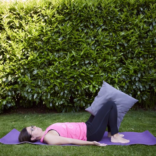 Unterlagere das Becken, den unteren Rücken mit Kissen, damit das Becken höher liegt als der Bauchraum und die Brust. Der Beckenboden ist durch diese angenehme Lagerung entlastet, weil das Gewicht der Organe nicht mehr auf ihm lastet. Gerade wenn du manchmal ein Schweregefühl, ein Ziehen nach unten oder ein Druckgefühl spürst im Becken nimm‘ diese Übung mehrmals am Tag ein für mehrere Minuten.