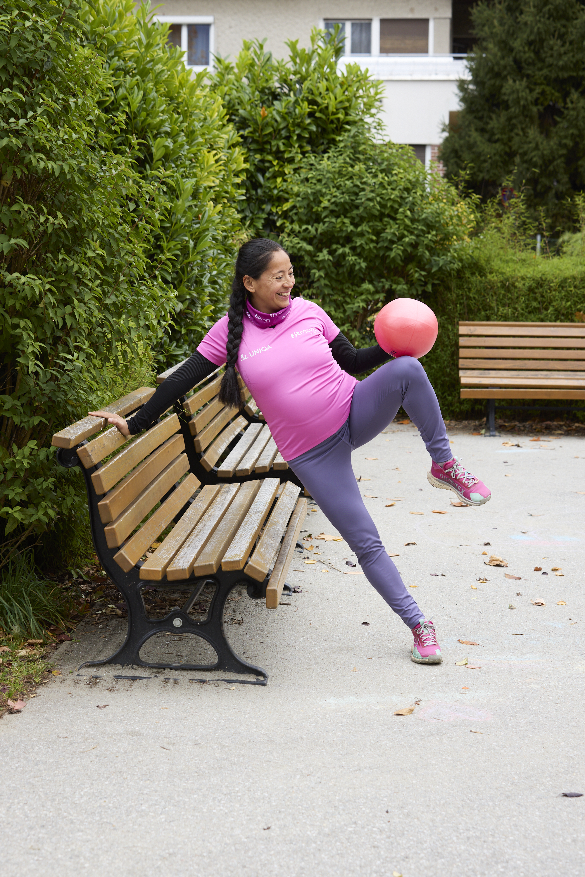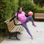 Suche dir eine Stützhilfe deiner Wahl. Dies kann eine Wand, eine Parkbank, ein Brunnen,.. sein. Sei kreativ. Du stützt dich hier in einen seitlichen Armstütz und hältst den Pilatesball in deiner freien Hand. Nun ziehen mit deiner Ausatmung der Arm mit deinem Bein zu einem seitlichen Crunch zusammen. Achte hier drauf den Beckenboden immer wieder in der Übungsausführung Richtung oben innen zu aktivieren. Wiederhole hier wieder 15x pro Stützseite.