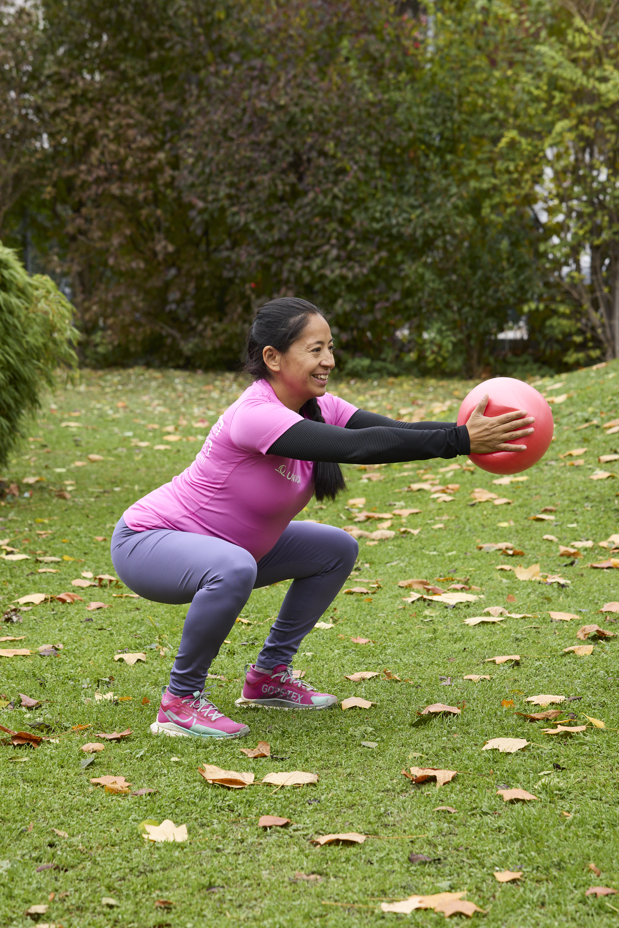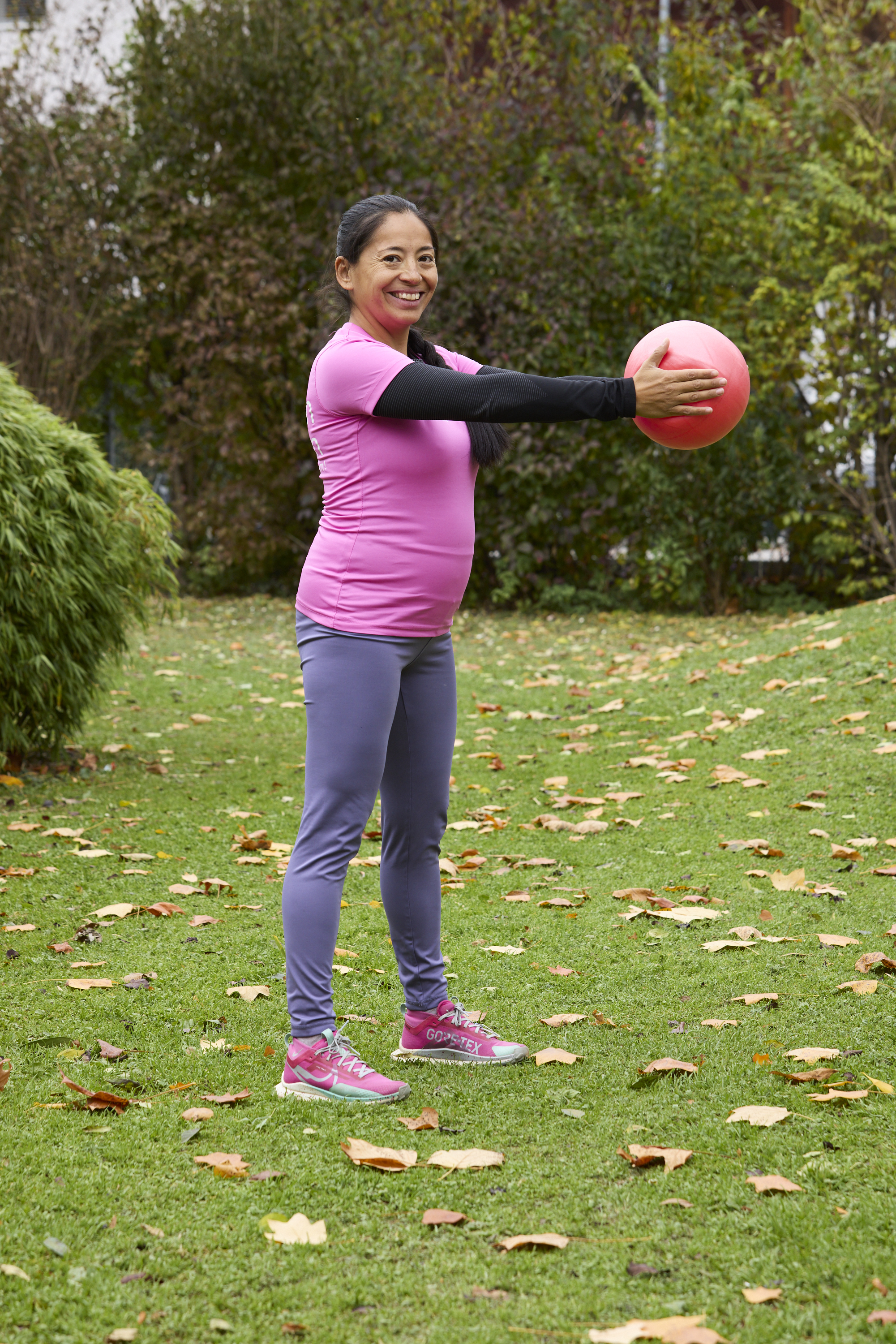 Besonders der Beckenboden und die tiefliegende Rumpfmuskulatur gilt es sowohl in der Schwangerschaft als auch nach der Geburt zu stärken. Hier kommt der Pilatesball in unseren fitmom Trainings zum Einsatz. Durch die runde und instabile Form des Balles, bringt er deinen Körper dazu ständig in kleine Ausgleichsbewegungen zu gehen. Diese unbewussten Korrekturen aktivieren genau die tiefliegende Muskulatur, die wir in diesem Training erreichen wollen und die dir in der Schwangerschaft und danach Stabilität und Halt gibt. Das Ziel ist also hier: Tiefenstärkung von innen nach außen.