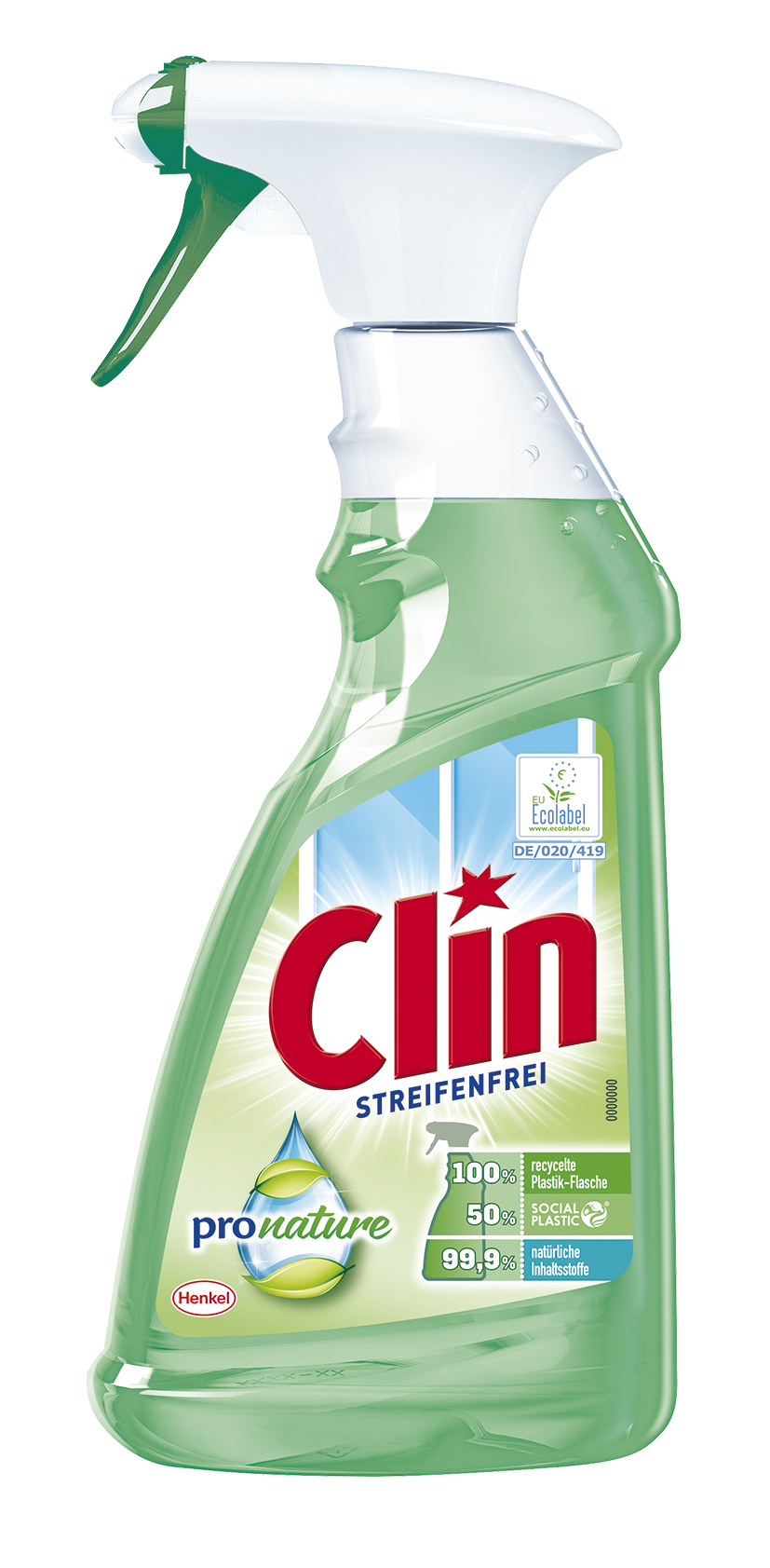 Die Formel des Glasreinigers Clin ProNature besteht zu 99,9 Prozent aus natürlichen Inhaltsstoffen und ermöglicht damit effektive Reinigung, saubere Wirkung und optimalen Glanz auf allen Oberflächen. Die Flasche stammt zu 100 Prozent aus recyceltem Material (rPET), wobei der Social Plastic-Anteil von 25 auf 50 Prozent verdoppelt wurde. Clin ProNature ist ECOLABEL-zertifiziert.