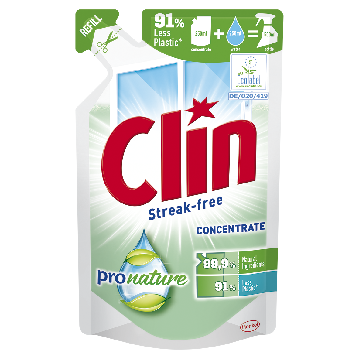 Hierzu gibt es nun auch Clin ProNature Nachfüllbeutel: Mit seiner konzentrierten Formel – dem 250ml Konzentrat müssen nur noch 250ml Wasser beigemengt werden – sorgt er auch dafür, dass um 91 Prozent weniger Plastik zum Einatz kommt.¹