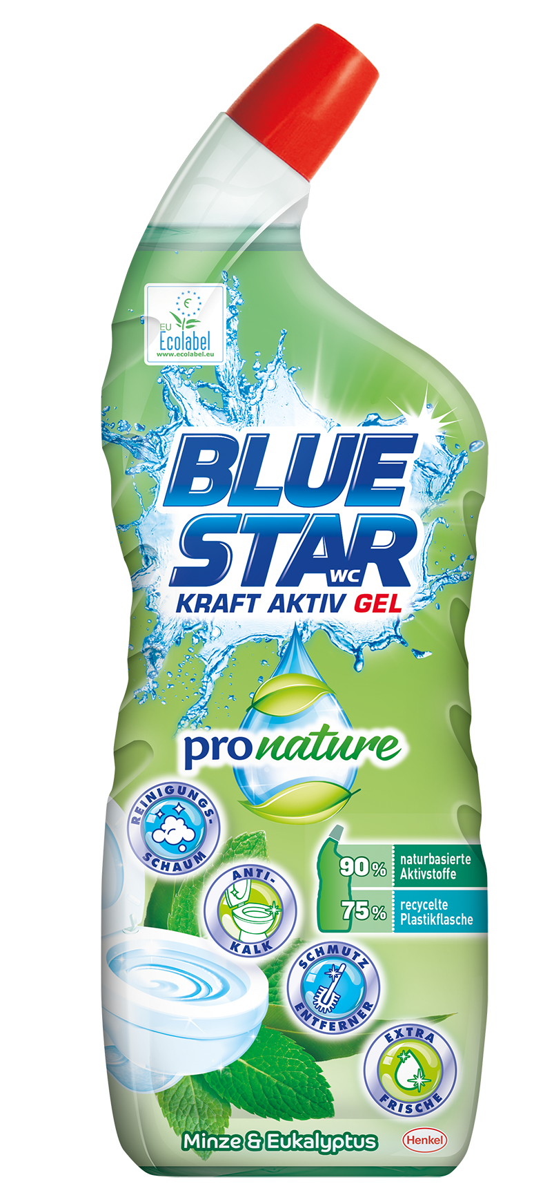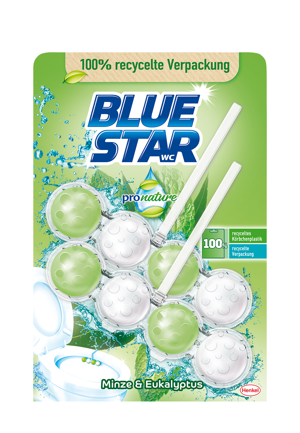 Zu den Blue Star Kraft-Aktiv Minze & Eukalyptus WC Steinen gesellt sich nun eine neue Variante: Grapefruit. Körbchenplastik, Blister-Karton und Blister-Plastik sind aus 100 Prozent recyceltem Material hergestellt. Den Blue Star ProNature WC Reiniger gibt es ebenfalls in den beiden Düften Minze & Eukalyptus sowie Grapefruit. Die WC Reiniger sind mit dem ECOLABEL gekennzeichnet.