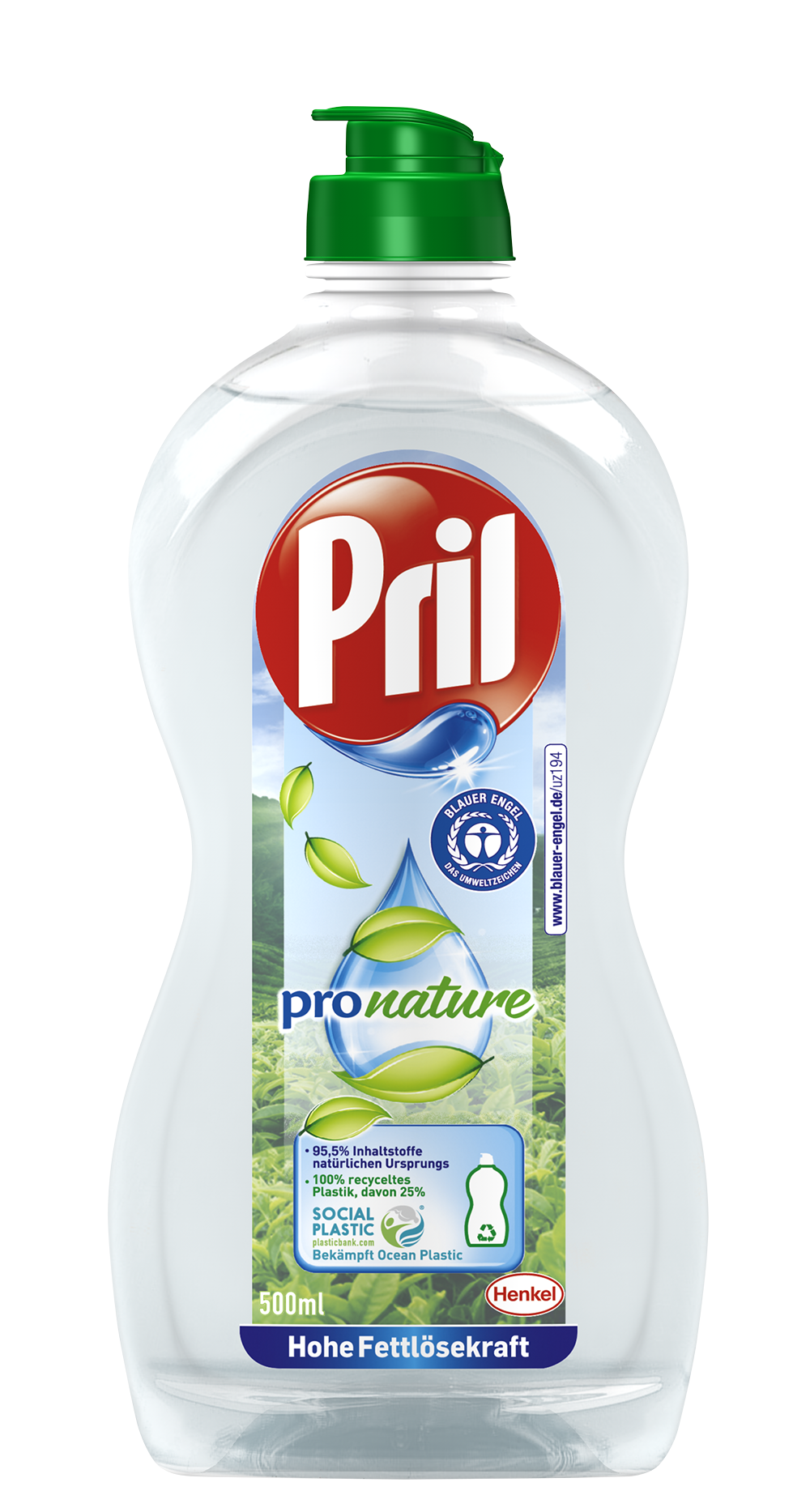 Pril ProNature enthält zu 95,5 Prozent Inhaltsstoffe natürlichen Ursprungs und erzielt damit optimale Reinigungskraft. Es wird auf den Einsatz von Farbstoffen verzichtet und die Verpackung ist zu 100 Prozent recycelt. Der Anteil an Social Plastic in der PET-Flasche wird von 25 Prozent auf 50 Prozent erhöht. Das Geschirrspülmittel ist mit dem Blauen Engel gekennzeichnet.