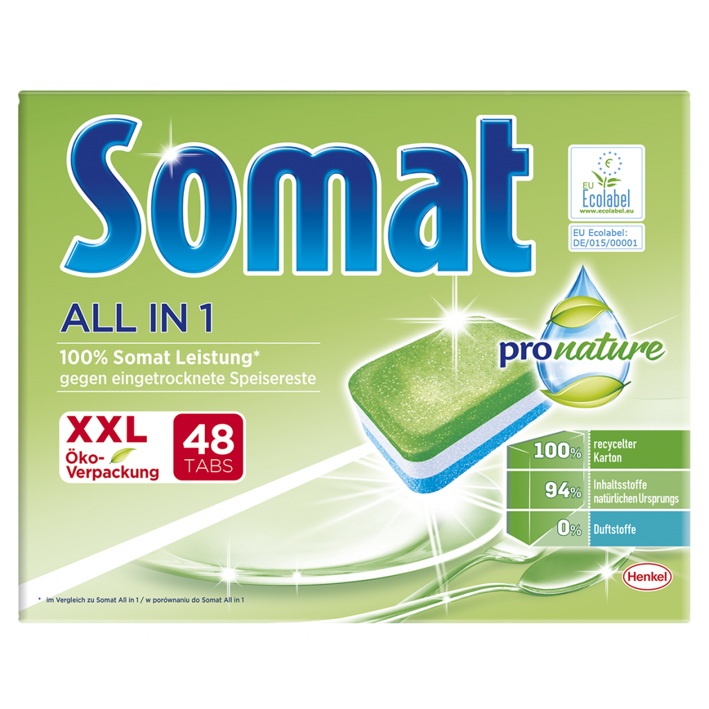Die Inhaltsstoffe der SOMAT ProNature All in 1 Tabs sind zu 94 Prozent natürlichen Ursprungs, auf Duftstoffe wird verzichtet. Die Tabs sagen eingetrockneten Speiseresten den Kampf an und sorgen für Glanz und Sauberkeit. Der Karton ist zu 100 Prozent recycelt.