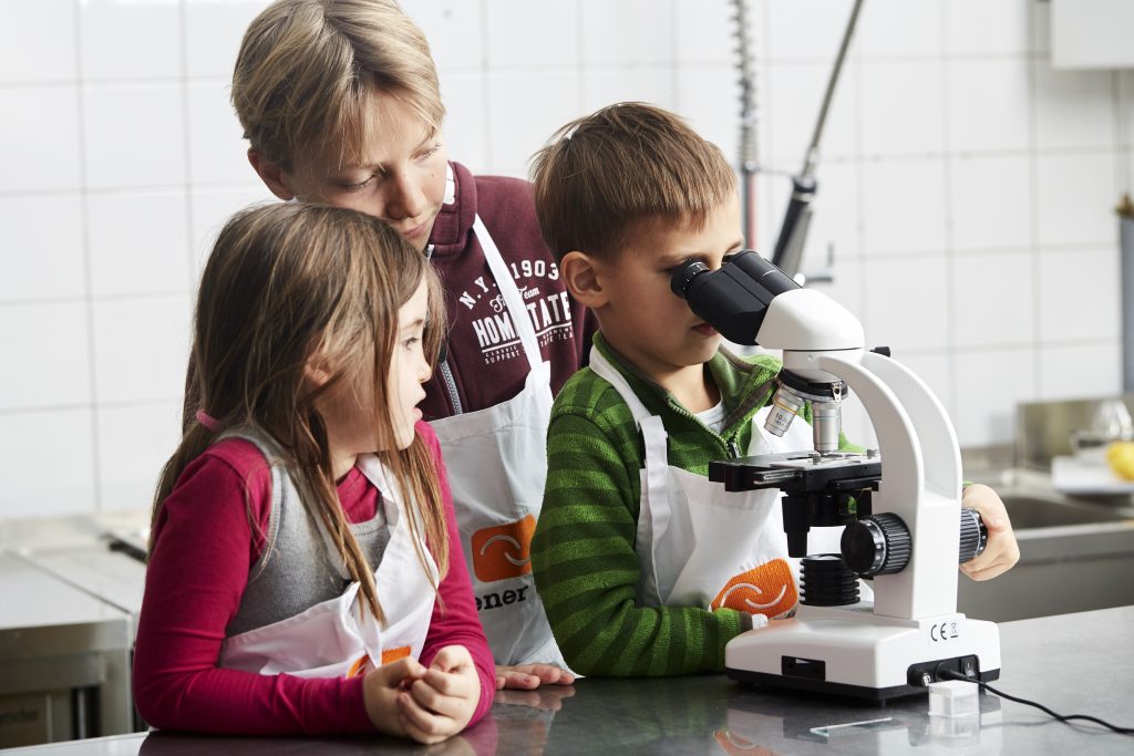 Genau hier setzen „Geschmacksschulungen“ an. Kinder lernen die faszinierende Welt der Geschmäcker und Aromen kennen. Es wird gerührt und geschnippelt, geerntet und geschnuppert, geraten, geforscht und gekostet. Expertinnen und Experten geleiten Schulklassen und Kleingruppen durch Quiz-Stationen, geben verblüffende Einblicke und wecken die Neugier auf mehr Hintergrundwissen. Mit verbundenen Augen werden Geschmäcker neu entdeckt, es wird verglichen und gefachsimpelt. Im Mikroskop sind die Zellen von Früchten und Blättern zu sehen, und darin die Carotinoide der Karotte oder das Chlorophyll in der Petersilie.