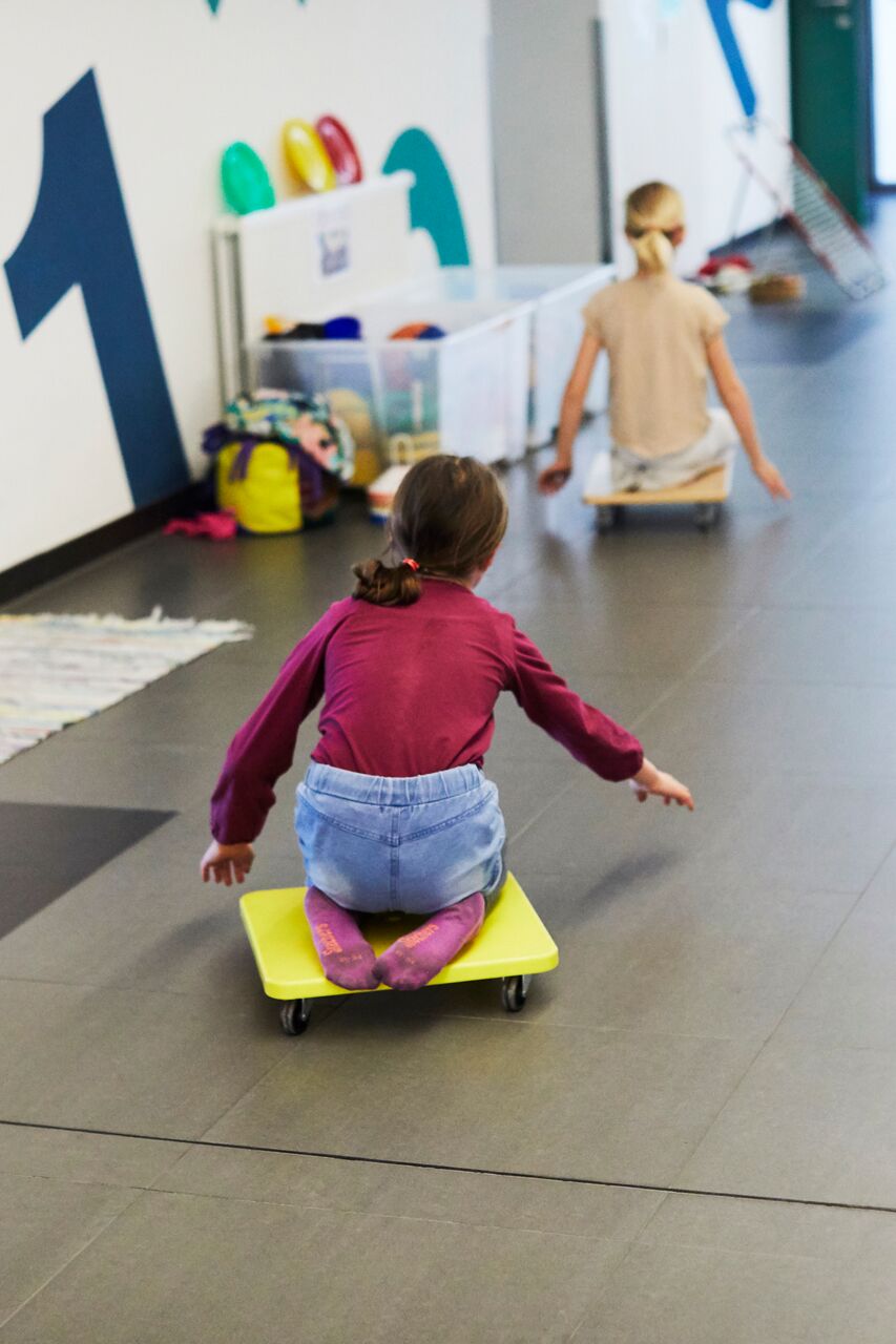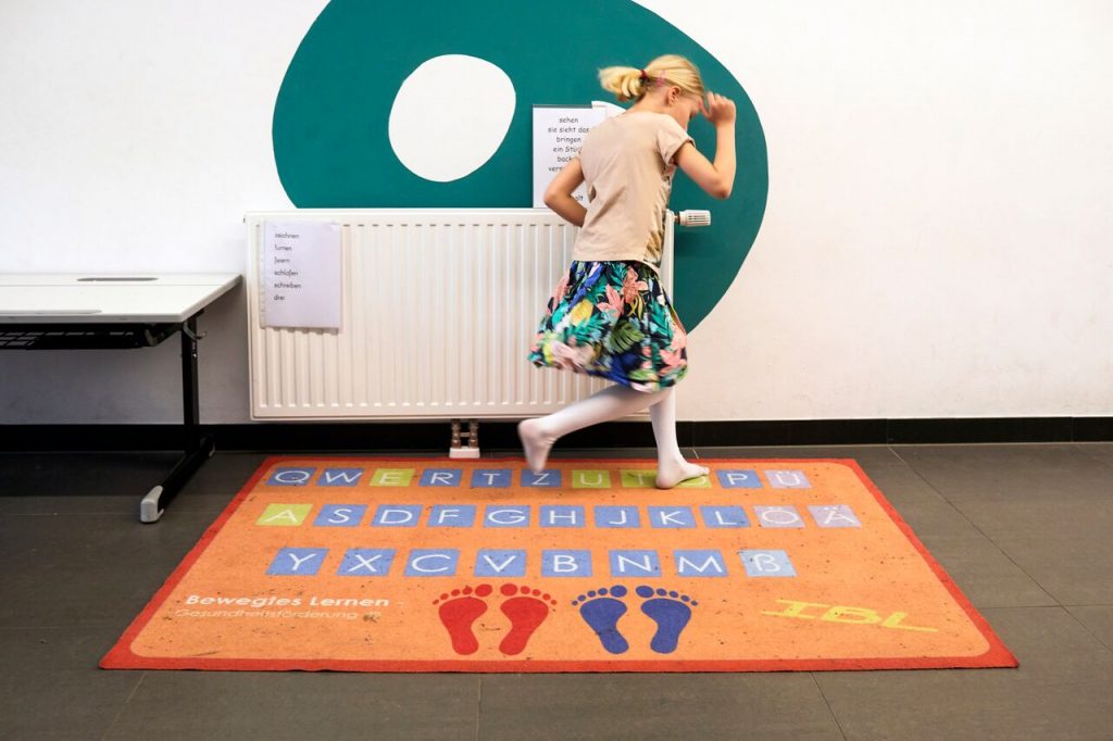 Ein Mädchen steht auf einem Stuhl, sie streckt sich, liest konzentriert von einem Zettel, der an der Wand hängt. Links neben ihr hüpft ein Mädchen in Strümpfen auf einem Teppich. Sie springt von Buchstabe zu Buchstabe – je komplizierter das Wort, das sie sich da erspringt, desto herausfordernder wird auch die körperliche Aufgabe. Zur gleichen Zeit kniet ein Junge am Ende des Gangs auf einem Rollbrett – auf dem Boden vor ihm stecken Rechenaufgaben in verschiedenen Gläsern. Rasch zieht er eine heraus und rollt schon wieder davon. Wir befinden uns im Campus Donaufeld, es ist Donnerstag morgen, und die Schüler der Klasse 3A sind gerade mitten bei der Arbeit. Und das sieht nicht nur auf den ersten Blick ein wenig anders aus als in manch anderer Schule. Denn diese Volksschule in Floridsdorf ist einer von 220 Standorten in Wien, an denen das Konzept „Bewegtes Lernen“ groß geschrieben wird.