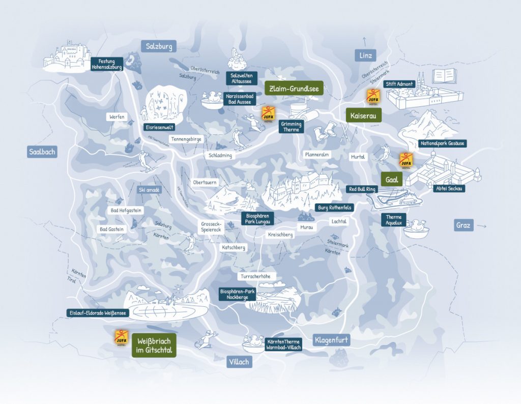 Teilnehmende JUFA Hotels und "Ski for free"-Regionen