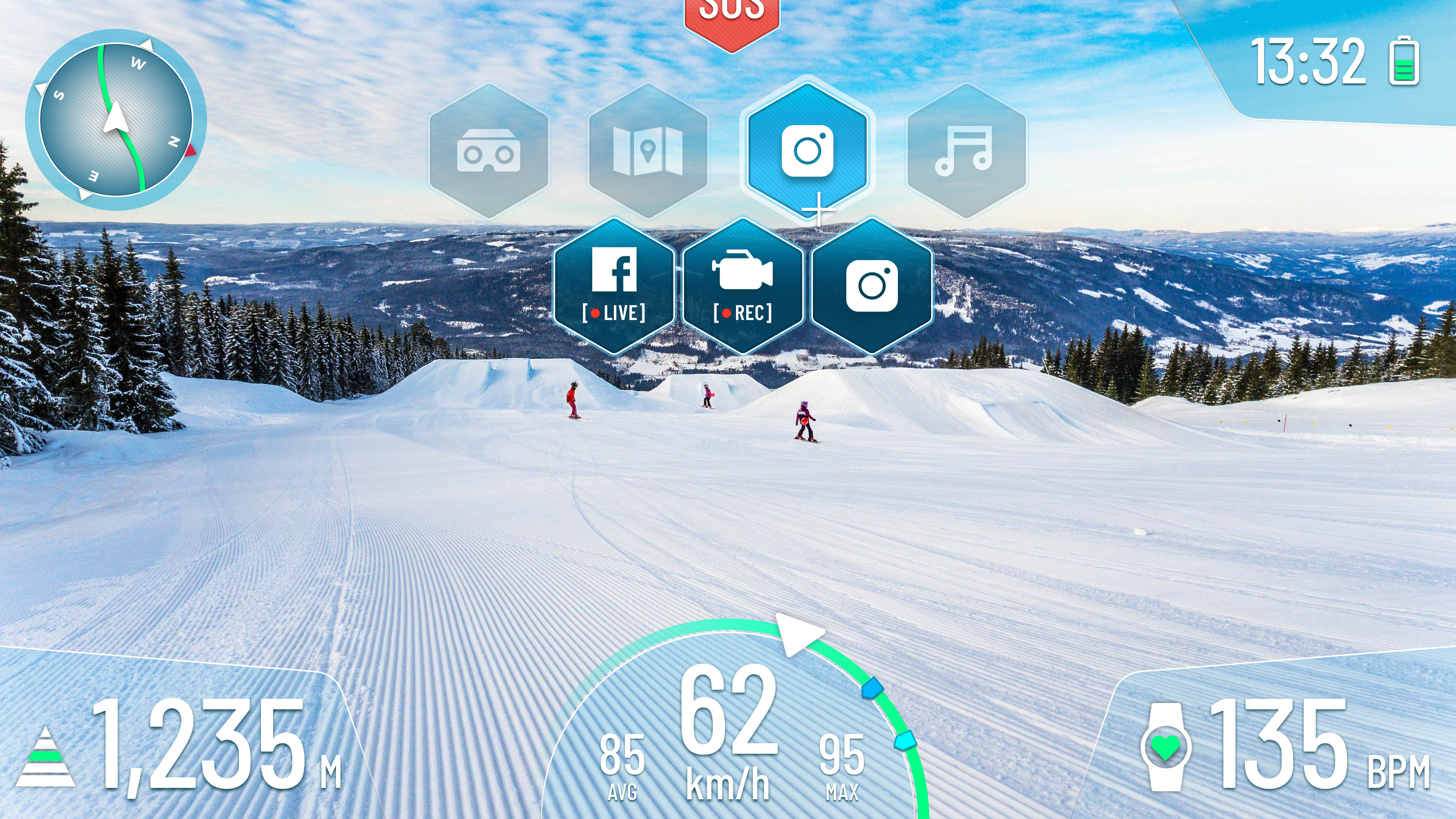 - Geschwindigkeit und Höhe: Die Skidaten des Fahrers werden auf dem Bildschirm angezeigt, sodass er diese während der Fahrt immer im Auge behalten kann.