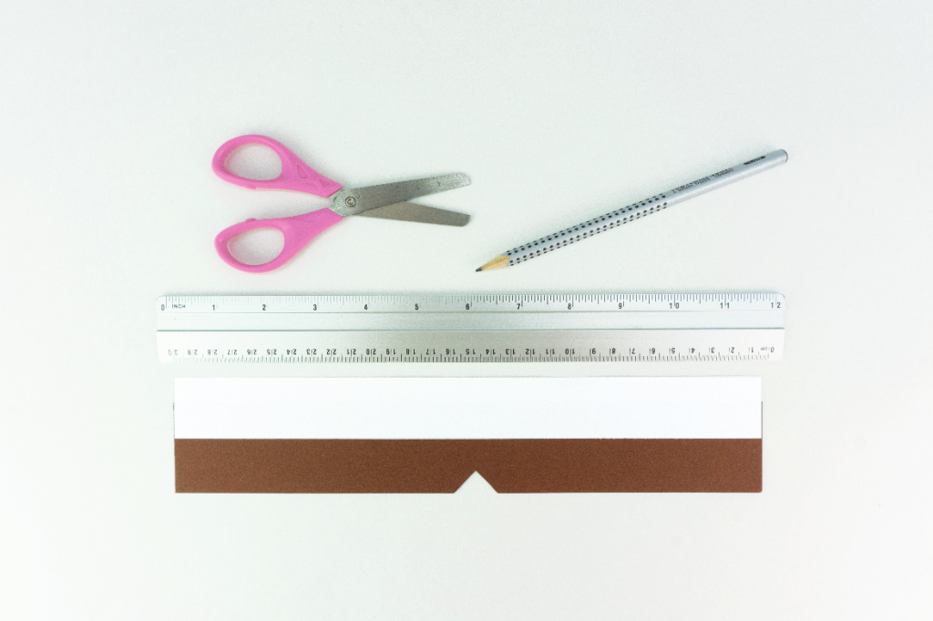 2. Schneide einen schmalen Streifen aus dem weißen Tonpapier aus, der einmal um den Schwamm passt. Dieser Streifen wird das Hemd. Schneide einen breiteren Streifen aus dem braunen Tonpapier aus, der genauso lang ist. Dieser Streifen wird die Hose. Schneide nun noch ein kleines Dreieck aus der Mitte der Hose.