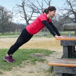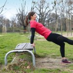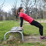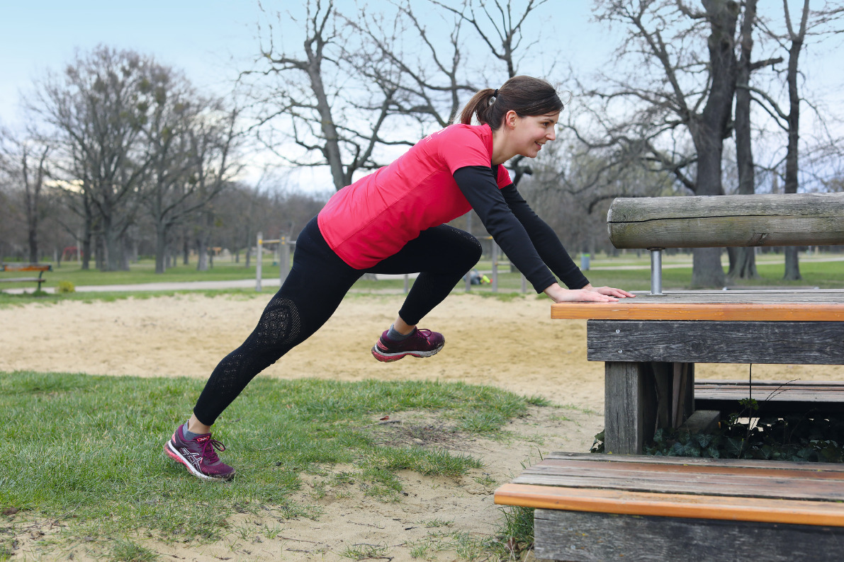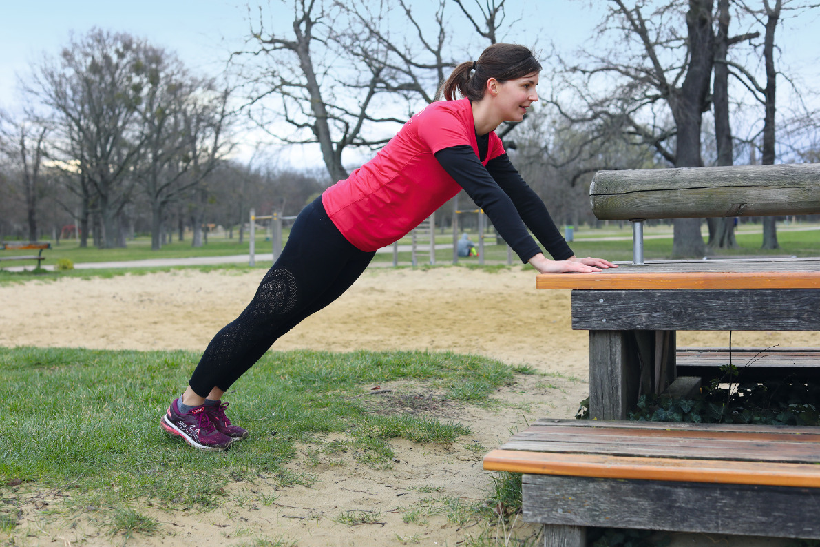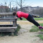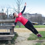 Ausführung: Auf einer erhöhten Fläche mit den Händen stützen und den gesamten Körper in eine Ebene bringen. Bauchnabel und Beckenboden ziehen fest nach innen, der Kopf ist auf der Brust. Nun abwechselnd die Beine strecken, wobei der Körper stets auf einer Ebene bleibt und die Hüfte NICHT zur Seite oder das Gesäß nach unten kippt.