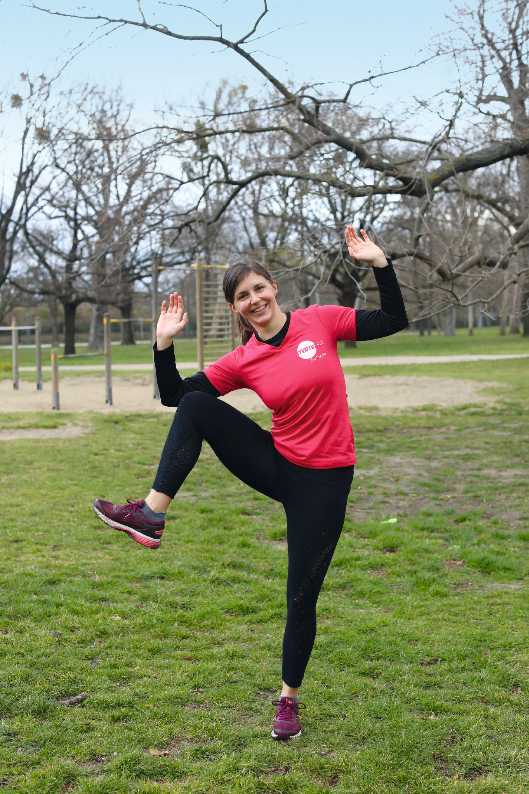 Ausführung: Aufrecht Bauchmuskulatur und Beckenboden aktivieren. Mit der Ausatmung das Knie seitlich nach oben heben und ganz klein zum gleichseitigen Ellbogen zusammenziehen. Mit der Einatmung das Bein wieder absenken und es anschließend mit der Ausatmung wieder anheben.