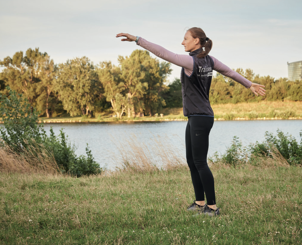 Grundhaltung einnehmen. Mit sanftem Schwung den rechten Arm nach vorne und den linken Arm nach hinten ziehen. Die Schultern ganz locker lassen. Beim Seitenwechsel der Arme leicht in die Knie gehen. Gleichmäßig atmen und der Oberkörper dreht jeweils sanft mit.