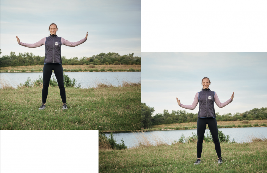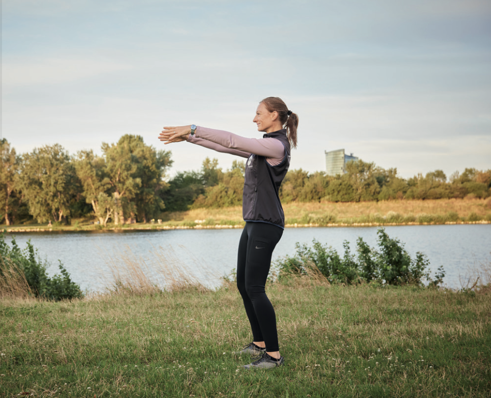Grundhaltung einnehmen, die Arme auf Schulterhöhe nach vorne strecken. Nabel zur Wirbelsäule ziehen.