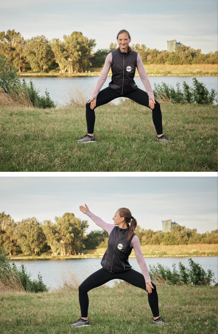 In eine Grätsche stellen und die Knie beugen. Die Handrücken an die Innenseite der Knie bringen. Schulterblätter und Nabel zur Wirbelsäule ziehen. Ausatmen und einen Arm nach schräg oben und hinten ziehen. Der Oberkörper dreht mit – das Becken bleibt fixiert und zeigt die ganze Zeit nach vorne. Einatmen und in die Ausgangsposition zurück kommen, dann Seitenwechsel.
