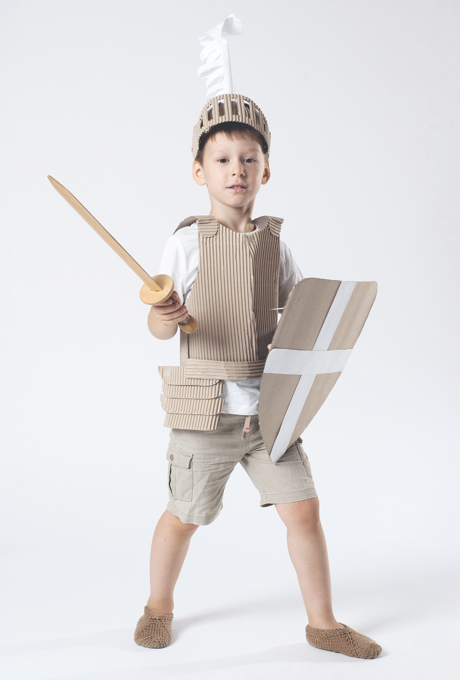 Mit Panzer und Schild aus Karton ist der furchtlose Ritter vor jedem Angriff geschützt.