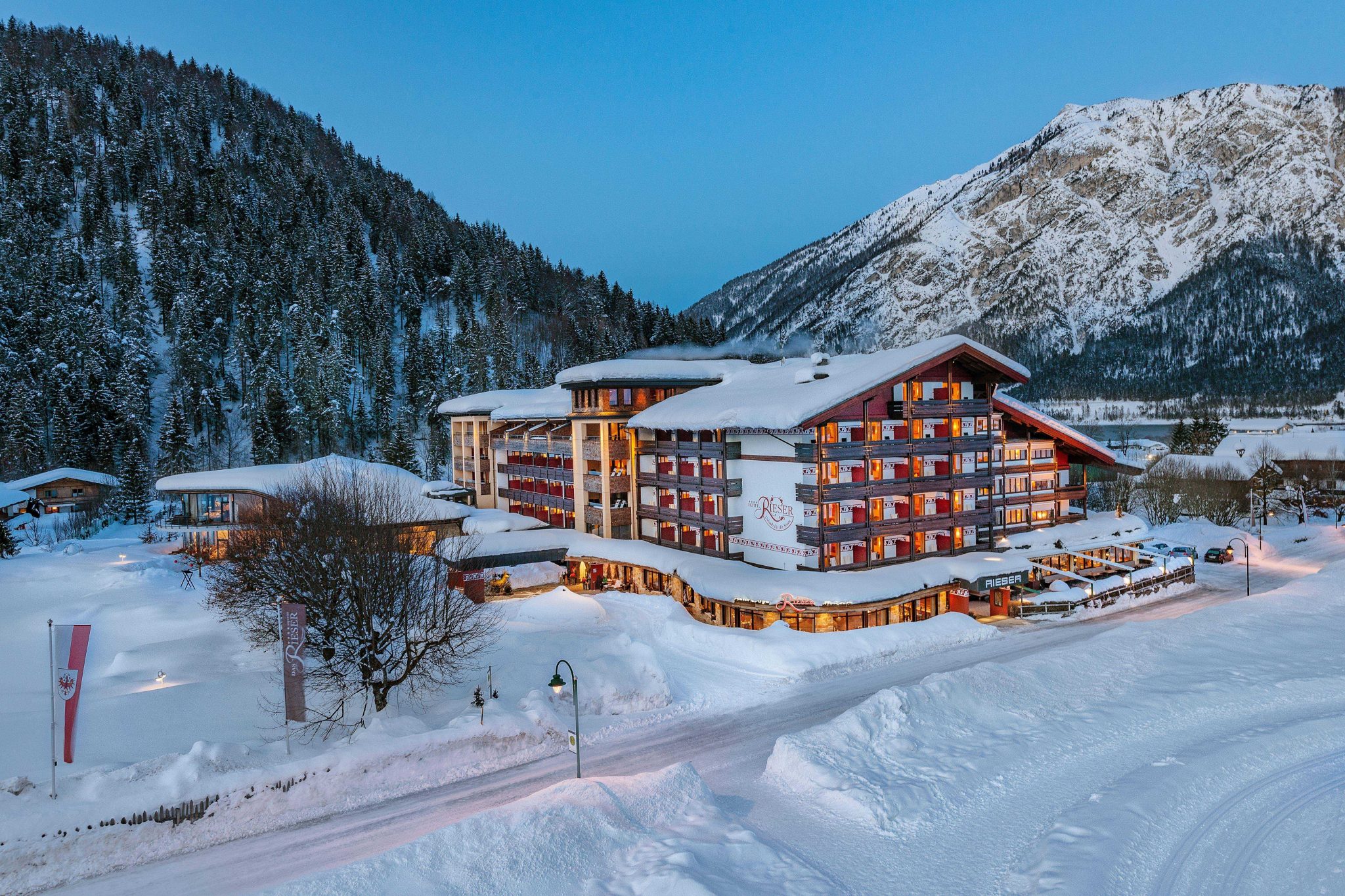 Der Wintergenuss beginnt im Hotel Rieser unmittelbar vor der Haustüre: Zum Skifahren im Karwendel, zum Langlaufen, zum Winter- und Schneeschuhwandern, Touren gehen oder Rodeln in den Karwendeltälern muss man das Auto nicht starten. In Summe verlocken um den zwölf Kilometer langen Achensee 120 Loipen- und 59 Pistenkilometer zum weit Ausschwingen. Der Tag klingt bei einem romantischen Degustationsmenü aus, für das Andreas Stadler und sein Küchenteam ihre Kreativität ausleben. Dazu passt ein köstlicher Tropfen aus dem gut sortierten Weinkeller von Ernst und Gabi Rieser, die ihr Aktiv & Spa Resort bereits in dritter Generation führen.
