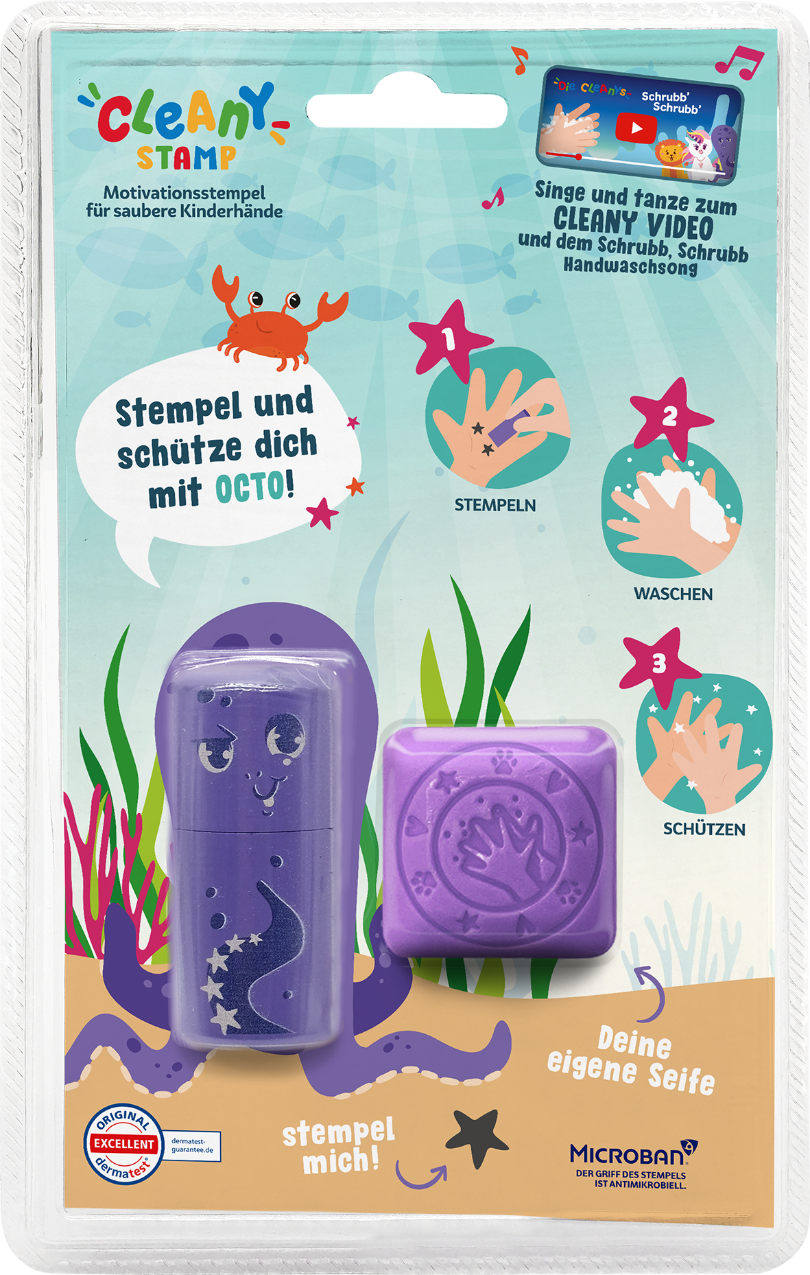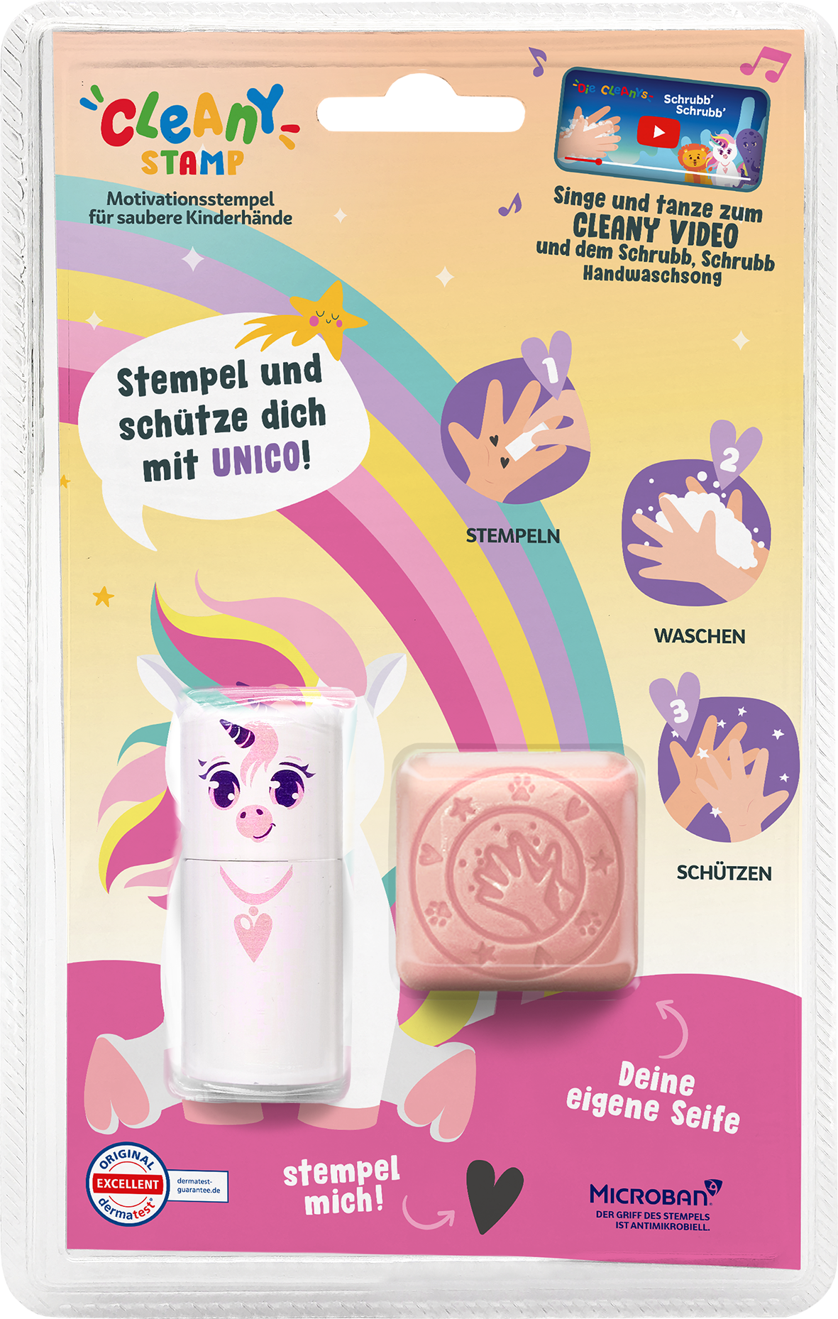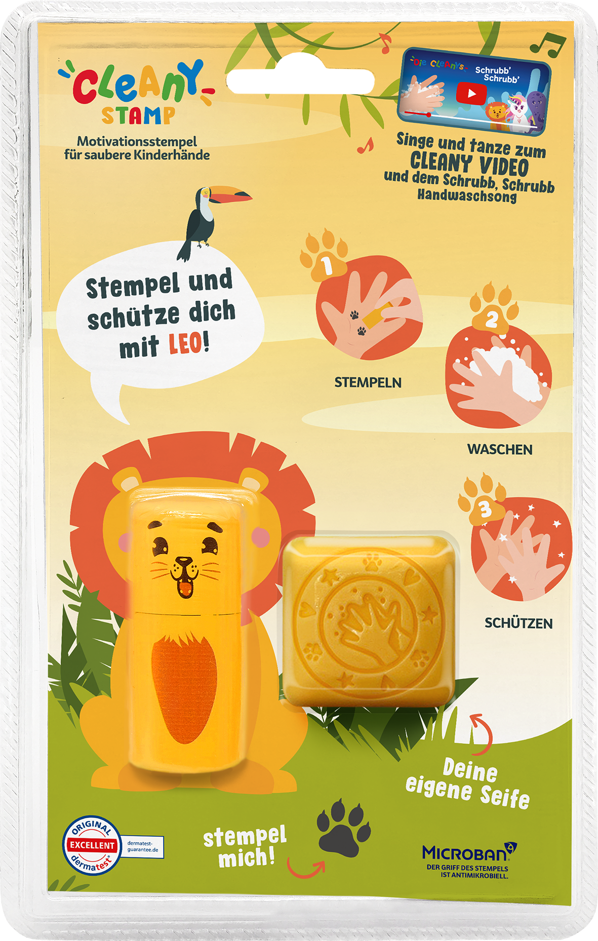 Die Händewasch-Stempel-Edition „Cleany“ ist derzeit in drei Ausführungen erhältlich und soll Kinder im Alter von ca. drei bis acht Jahren ansprechen: Der orange „Cleany“-Löwe macht Tatzen-Abdrucke, der lilafärbige „Cleany“-Oktopus stempelt Sternchen auf Kinderhände und der weiße Einhorn-„Cleany“ verteilt Herzchen.