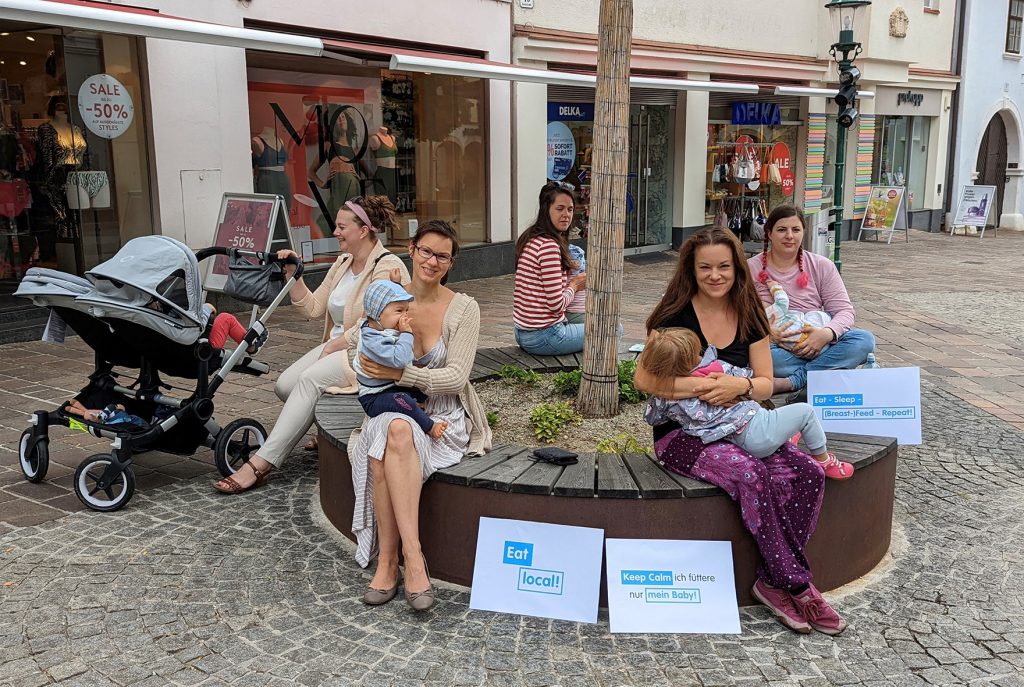 Doch nicht nur in Wien haben sich Mamas zum Still-In versammelt: Auch in anderen Bundesländern Österreichs haben Gruppen ein solidarisches Zeichen für die Normalisierung gesetzt. U.a. auch in Eisenstadt, wo Hebamme Eva Schranz und ihr „Babytreff“ die Fußgängerzone in Eisenstadt für ihre Aktion nutzten. „Wir kennen einige Mütter persönlich, die sich sehr unwohl und unsicher beim Stillen oder Flasche Geben in der Öffentlichkeit fühlen, aus Angst vor negativen Reaktionen. Umso mehr war es