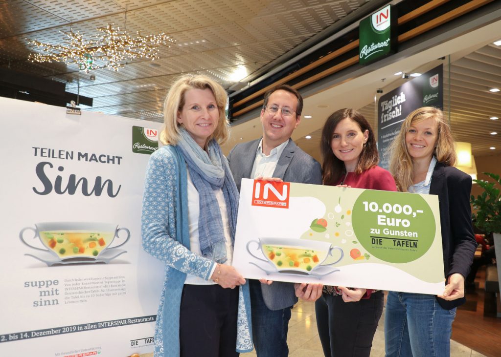 In insgesamt 50 INTERSPAR-Restauraunts stand in den ersten zwei Wochen im Dezember „Suppe mit Sinn“ auf der Speisekarte. Für jeden verkauften Teller in diesem Aktionszeitraum ging ein Euro an den Verband der Österreichischen Tafeln.