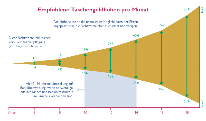 Ab einem Alter von zehn bis 14 Jahren kann man auch daran denken, Teile des Taschengelds auf ein Jugendkonto zu überweisen. Da es hier schon um Summen von bis zu 40 Euro monatlich gehen kann, ist der Umgang mit Konto und Karte eine gute Übung. Eltern sollten aber individuell entscheiden, ob ihr Kind reif genug für diesen Schritt ist.