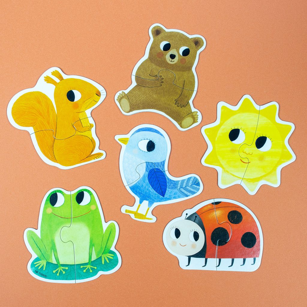 Den ersten Schritt zum richtigen Puzzeln können die Kleinsten mit den entzückenden Tieren des 6 Form-Puzzles von Goula machen. Ob Frosch, Bär oder Vögelchen, der kleine Marienkäfer, das schlaue Häschen oder die strahlende Sonne – alle werden ganz rasch zu freundlichen Gefährten. Jedes der sechs Papp-Puzzles besteht aus zwei Teilen, die Kinder bereits ab zwei Jahren gut ineinanderfügen können. Das macht nicht nur Spaß, sondern fördert zugleich auch das Gefühl für Farben und Formen.
