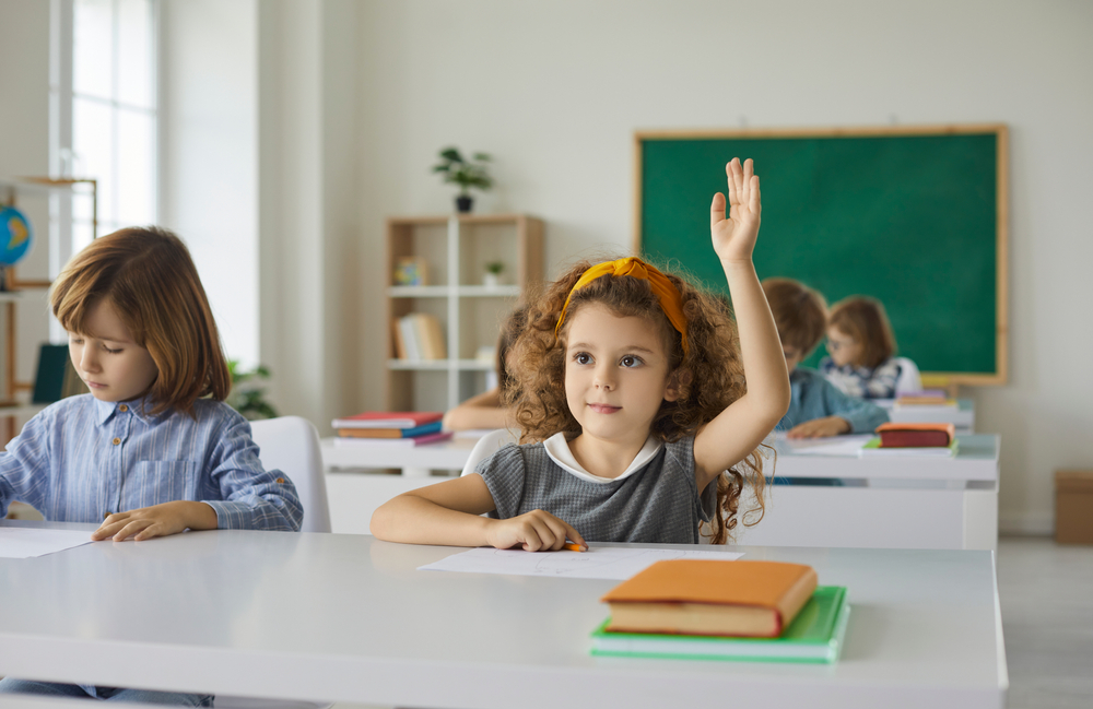 Elementary,School,Student,Raises,Her,Hand,,Ready,To,Answer,The