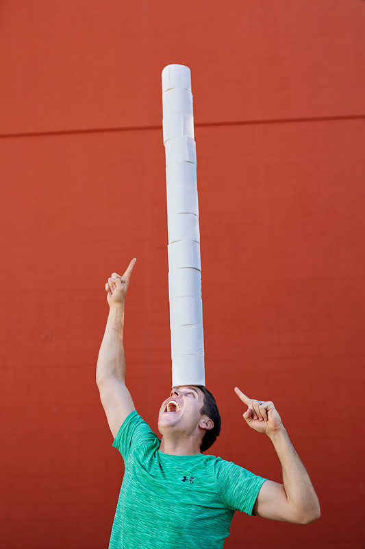 Zwölf Rollen Toilettenpapier so lange wie möglich auf dem Kopf balancieren – ganz schön schwierig.
